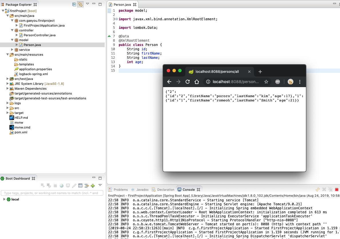 Person.java의 Person 객체에 getter와 setter 그리고 toString이 자동으로 생성된것을 알 수 있습니다.