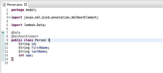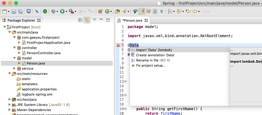 model/Person.java 파일을 열어서 Person 클래스 위에 @Data Annotation을 추가하고 Import 'Data' (lombok)을 추가합니다.