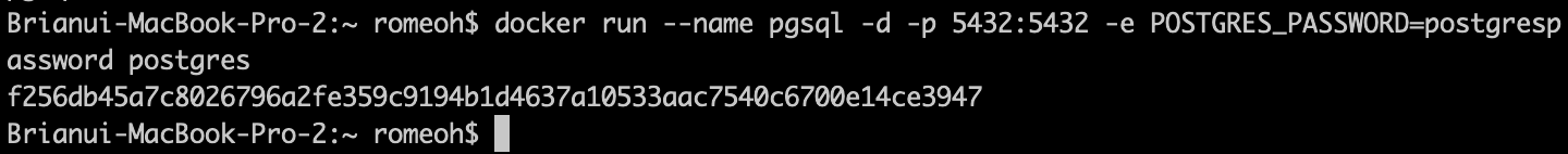 $ docker run --name pgsql -d -p 5432:5432 -e POSTGRES_PASSWORD=postgrespassword postgres