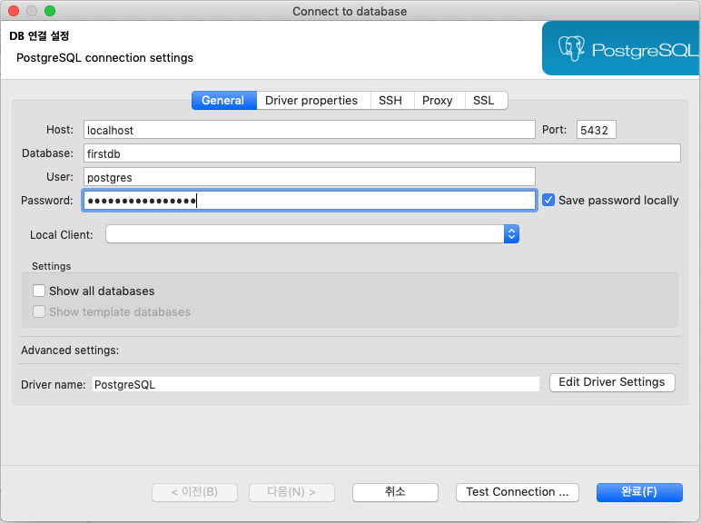 위 정보를 입력하고 Test Connection 버튼을 누릅니다.