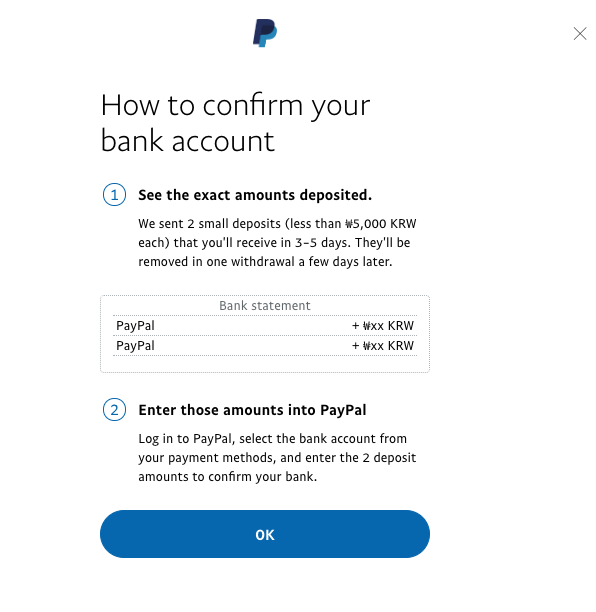 그러면 paypal 은행계좌에서 입금액 두개를 입력하라고 하네요.