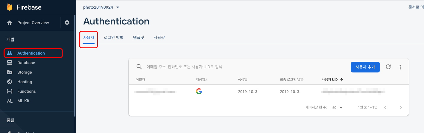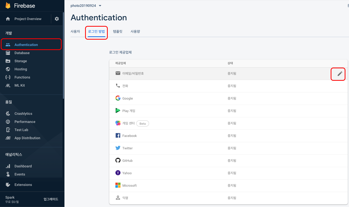 회원가입을 받기위해서 Firebase > Authentication > 로그인 방법으로 이동합니다.