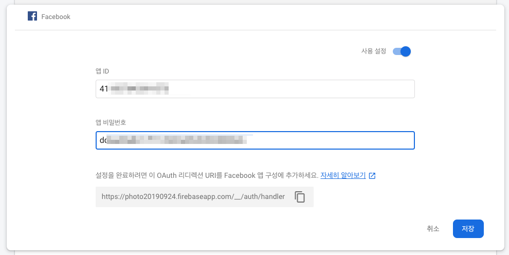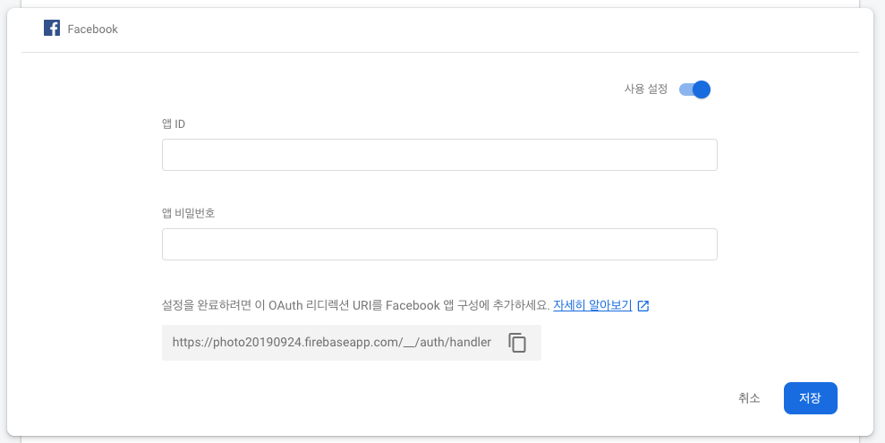 Facebook 사용설정합니다.