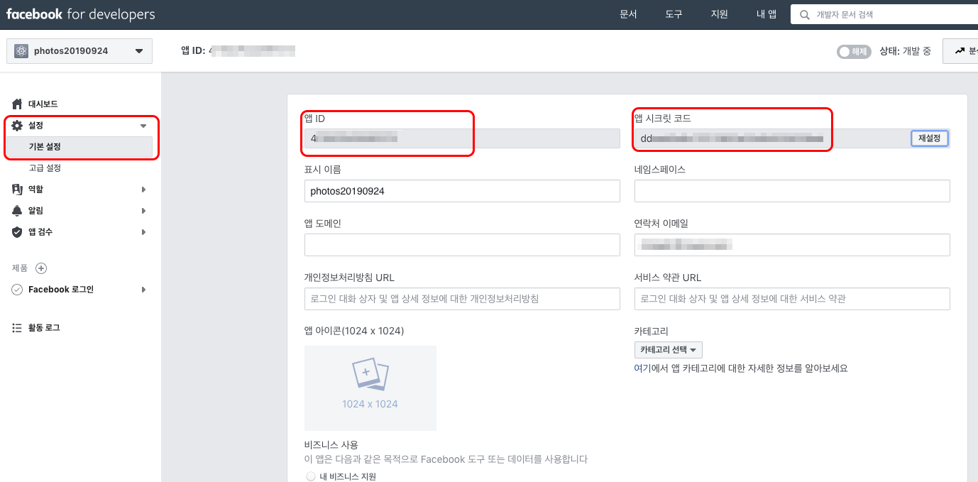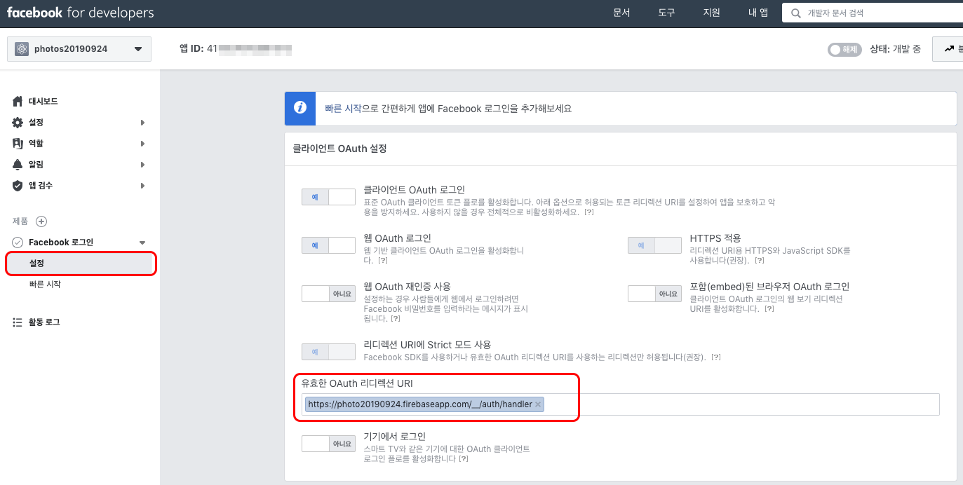 설정 > 기본설정에서 앱ID와 앱 시크릿 코드를 복사해서 Firebase에 붙여넣기 합니다.