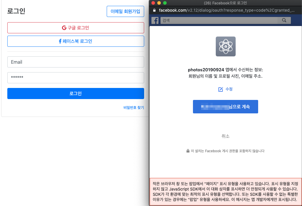 Facebook은 현재 개발 중 상태이기 때문에 localhost에서만 작동합니다.