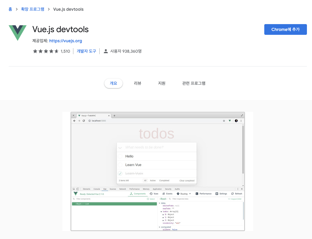 크롬 브라우저에서 위 주소에 가서 Vue.js devtools를 설치합니다.