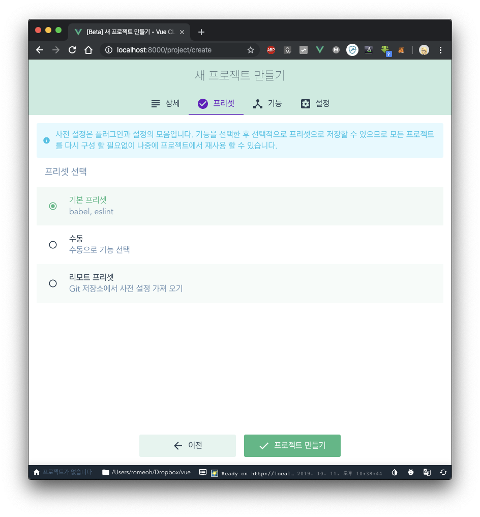 기본 프리셋을 선택하고 프로젝트 만들기를 누릅니다.