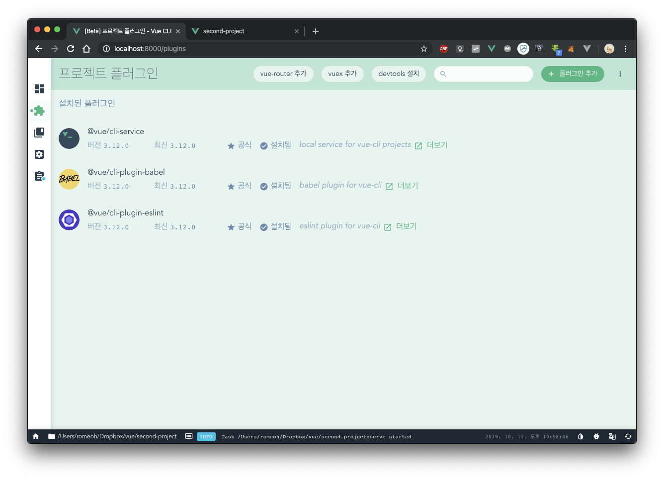 vue ui > 플러그인 에서 상단에 vue-router 추가 버튼을 누릅니다.