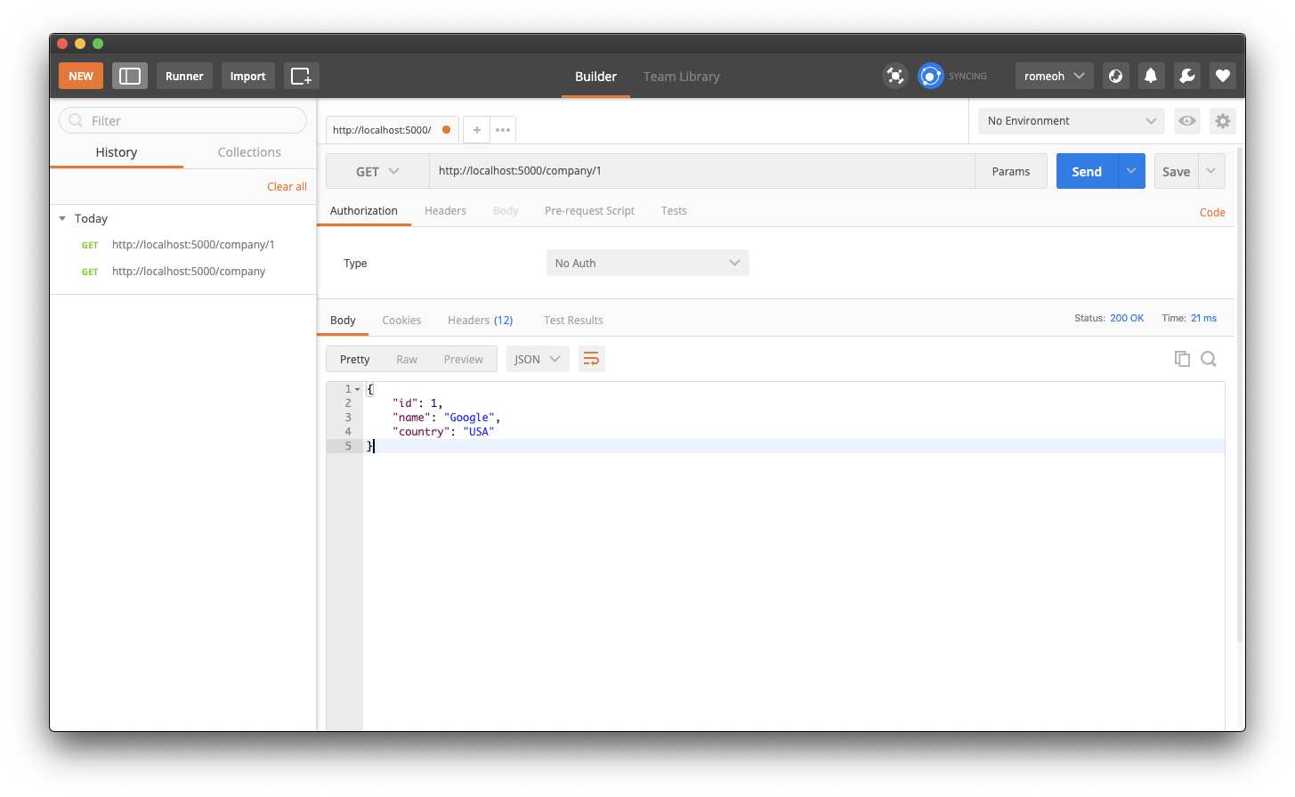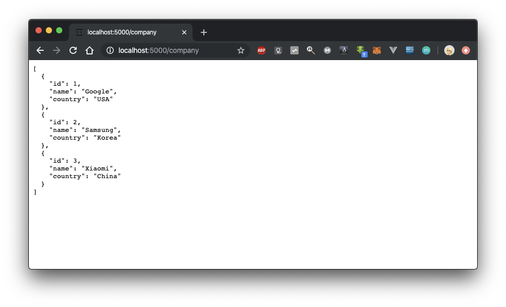 http://localhost:5000/company 브라우저로 접속하여 json 결과물을 확인할 수 있습니다.