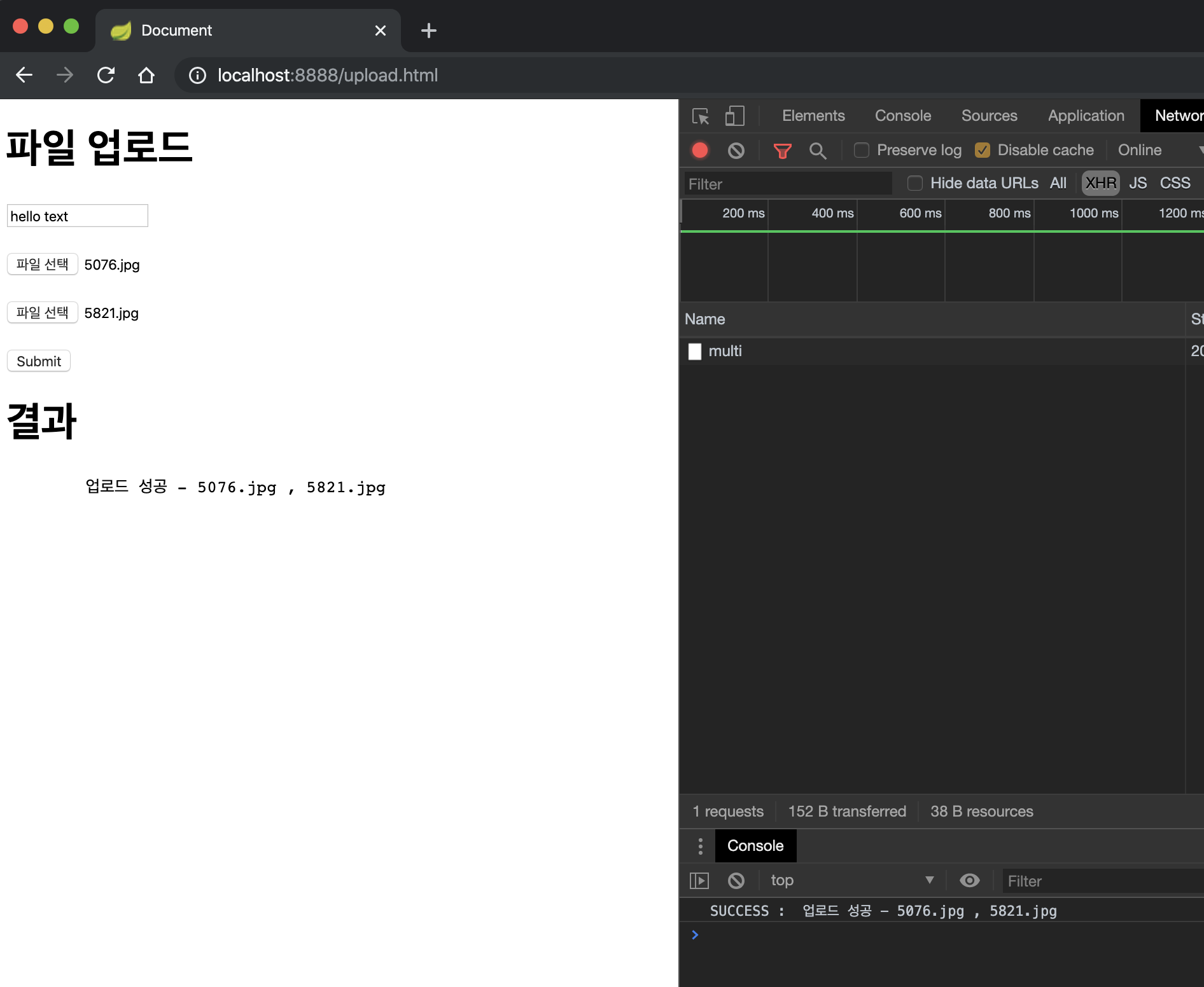 서버를 구동하고 브라우저로 접속해서 파일을 업로드 해봅니다.