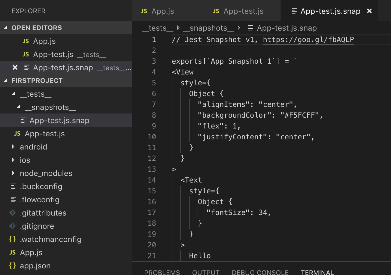 snapshot을 실행하면 /__test__/__snapshot__/App-test.js.snap 파일이 json으로 생성됩니다.