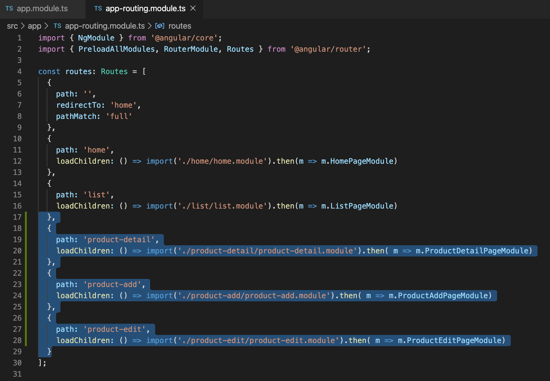 app-routing.module.ts 파일에도 추가된 모듈의 route가 자동으로 추가된것을 확인 할 수 있습니다.