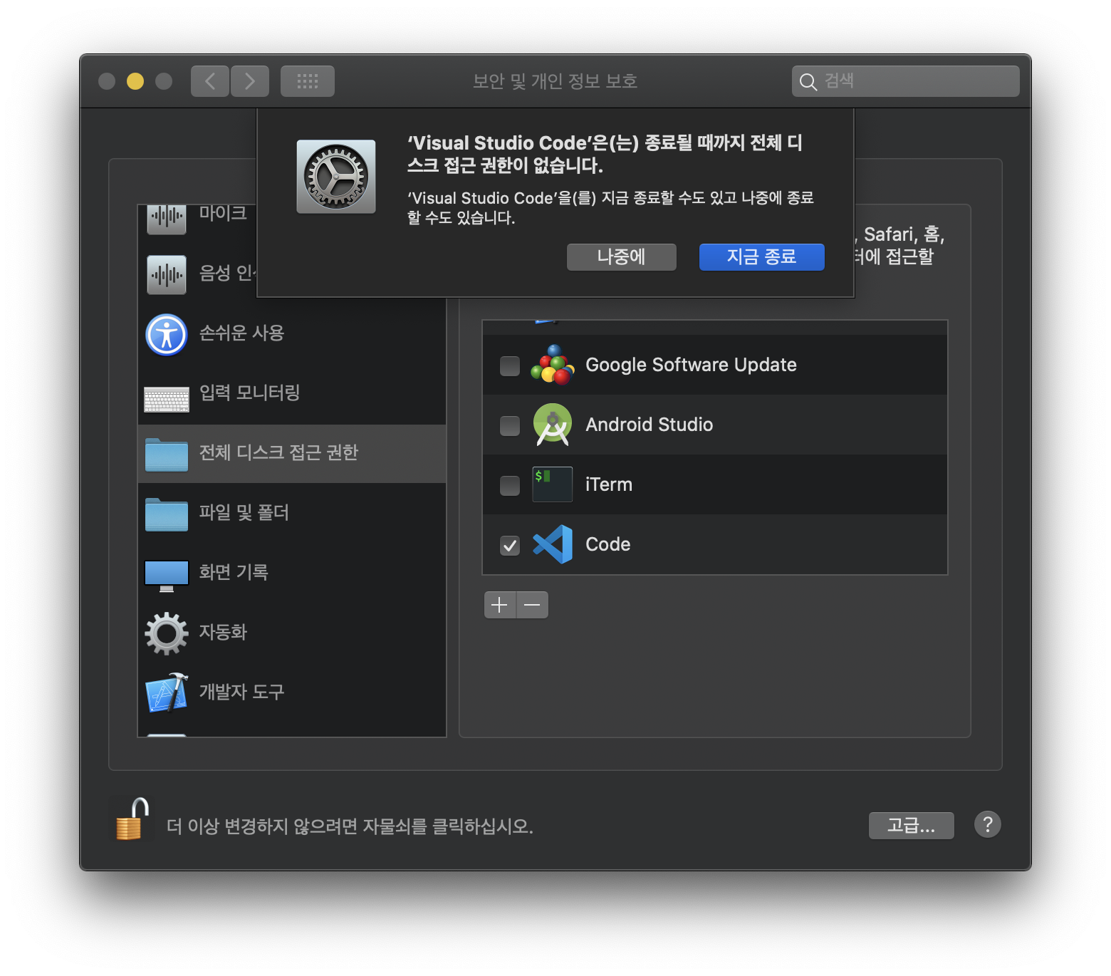 전체 디스크 접근 권한을 설정해보겠습니다.