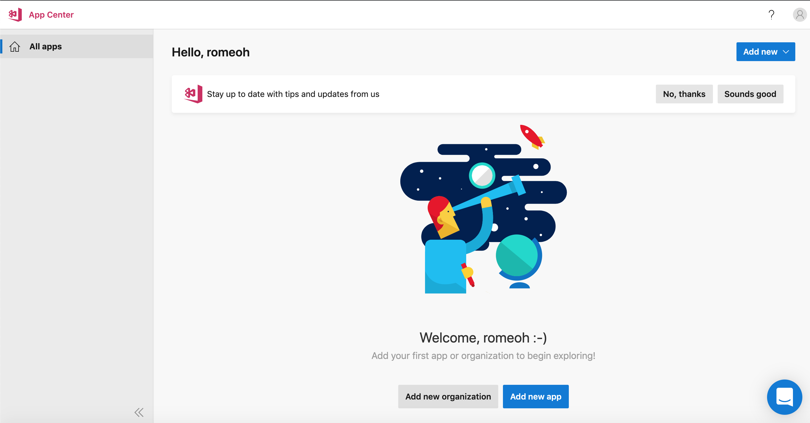 microsoft appcenter 가입합니다.