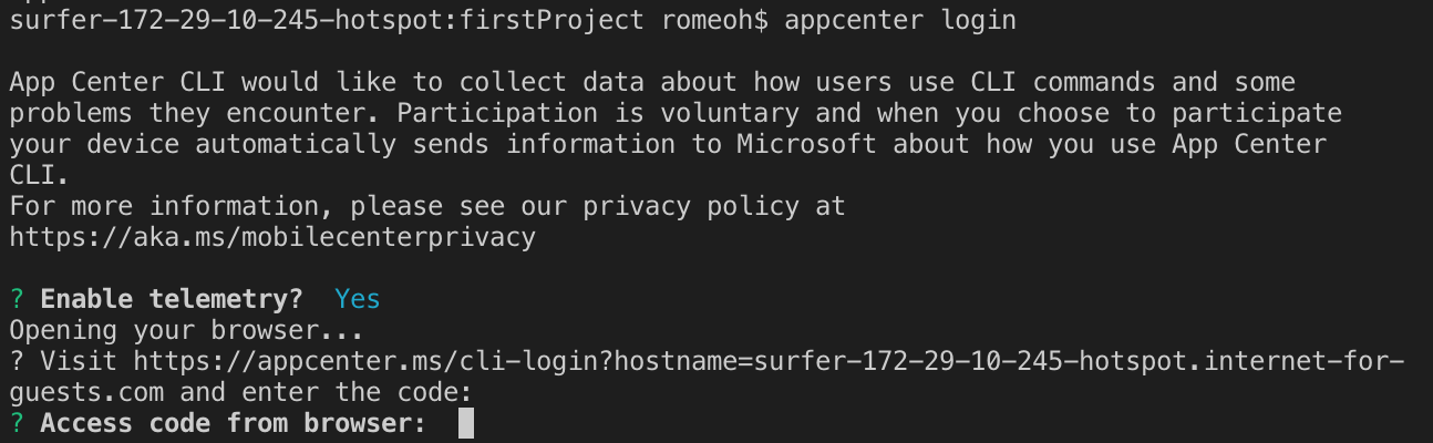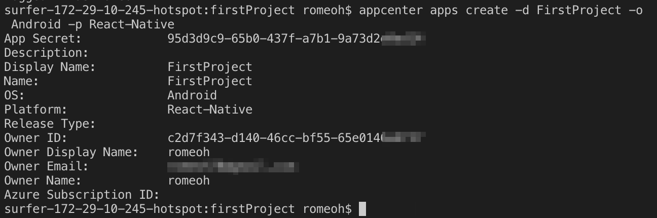 $ appcenter apps create -d FirstProject -o Android -p React-Native