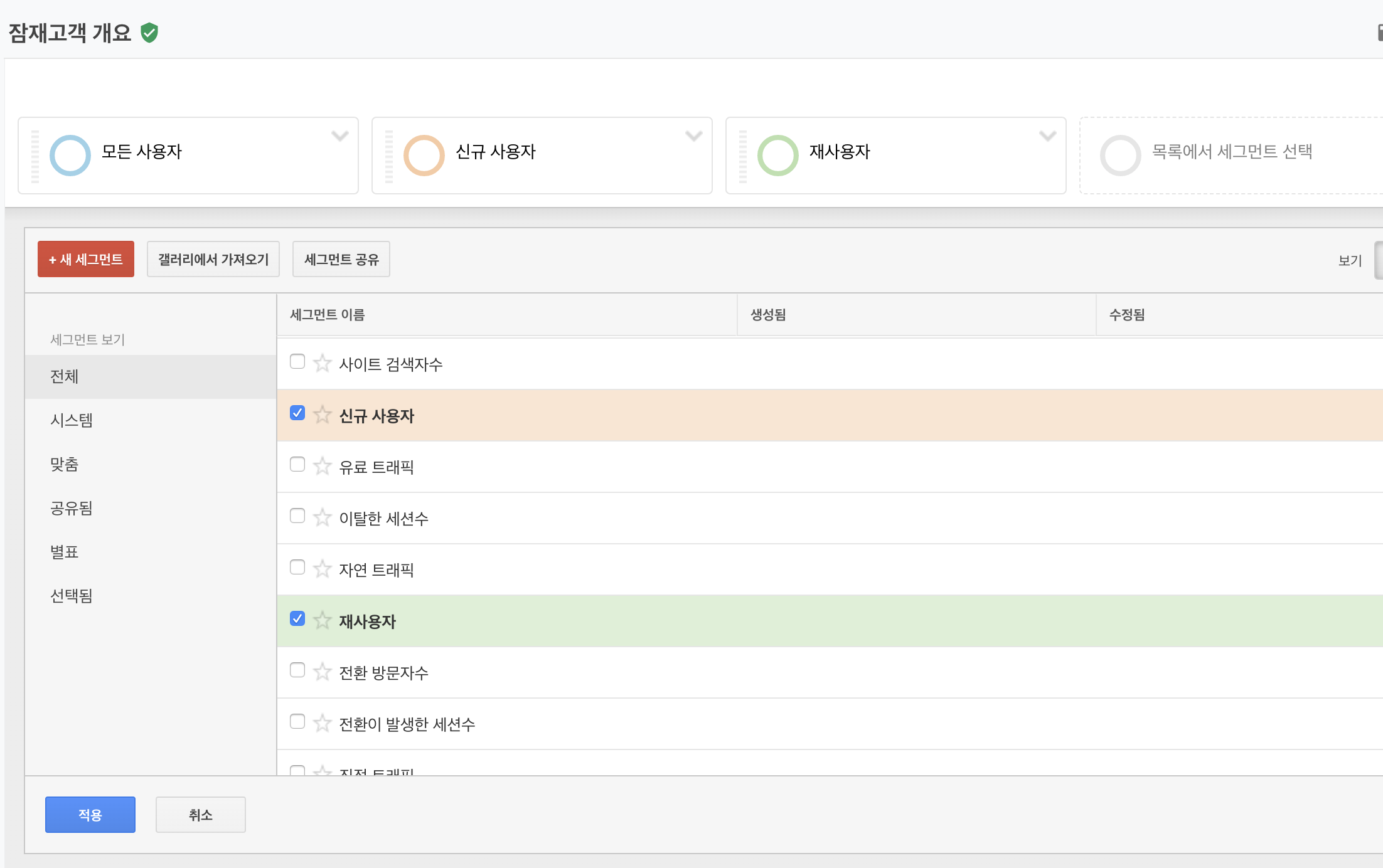 신규사용자, 재사용자를 선택하면 세그먼트에 추가됩니다.