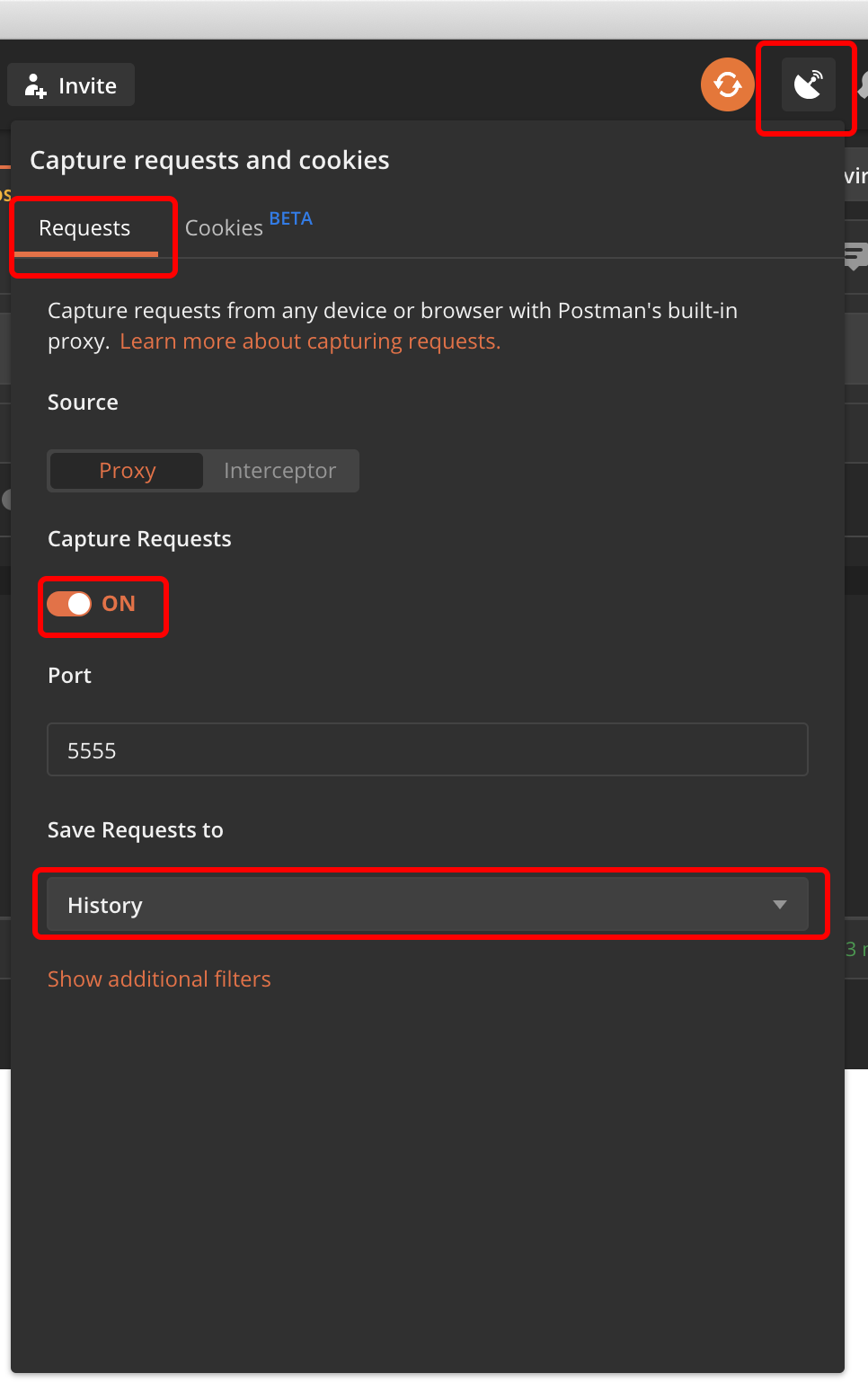 Postman에서 capture Request를 ON하고, Save Request to는 History를 선택합니다.