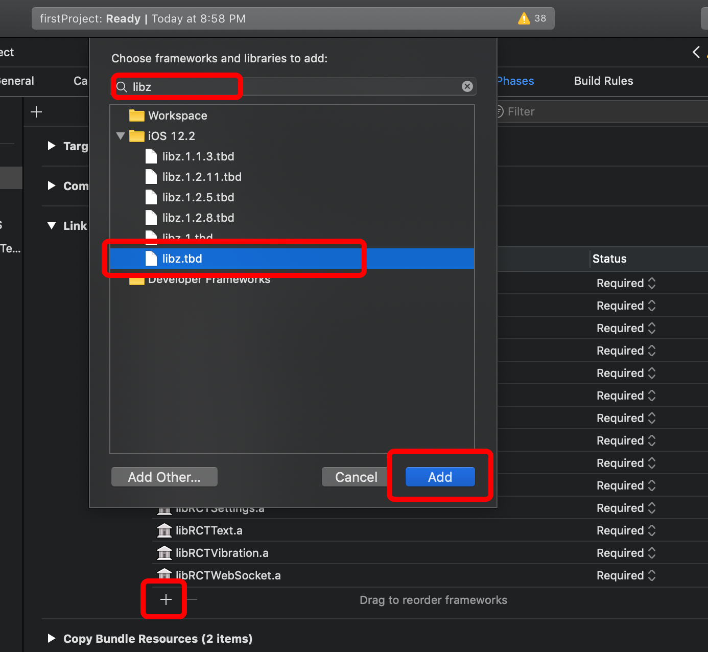 Link Binary With Libraries 하단에 + 버튼을 누르고 libz를 검색합니다.