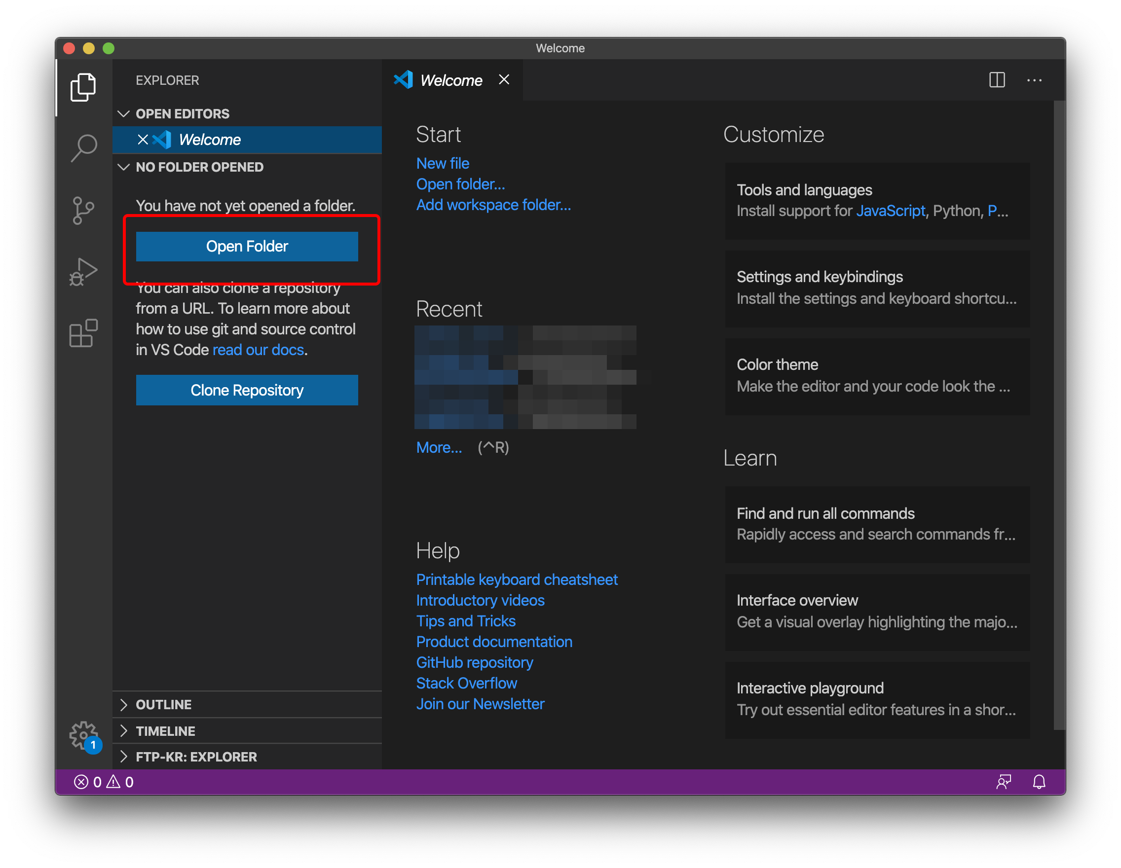 workspace가 생성되지 않았다면 Open Folder를 눌러서 Workspace를 설정합니다.
