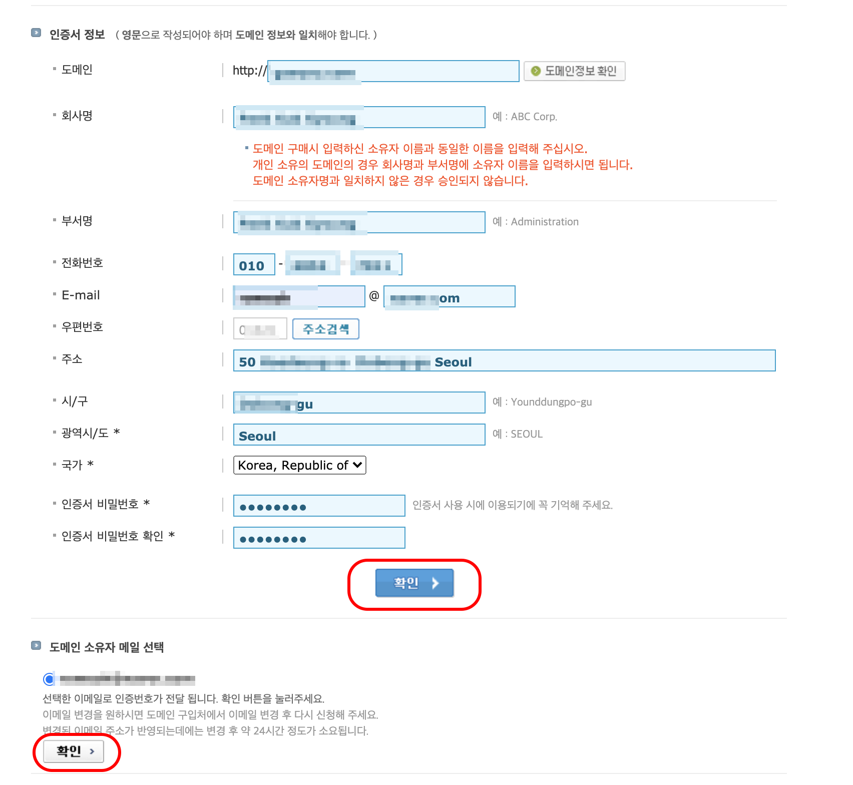 이때 주의할점은 회사명, 부서명이 도메인 신청시와 똑같이 입력해야 됩니다.