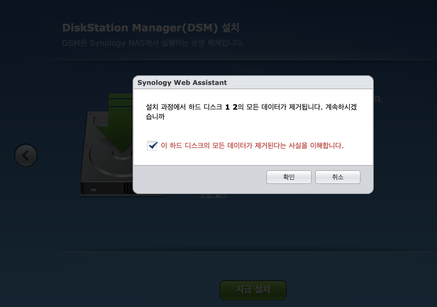 새 하드디스크니깐 데이터 제거된다고 확인하고 넘어 갑니다.