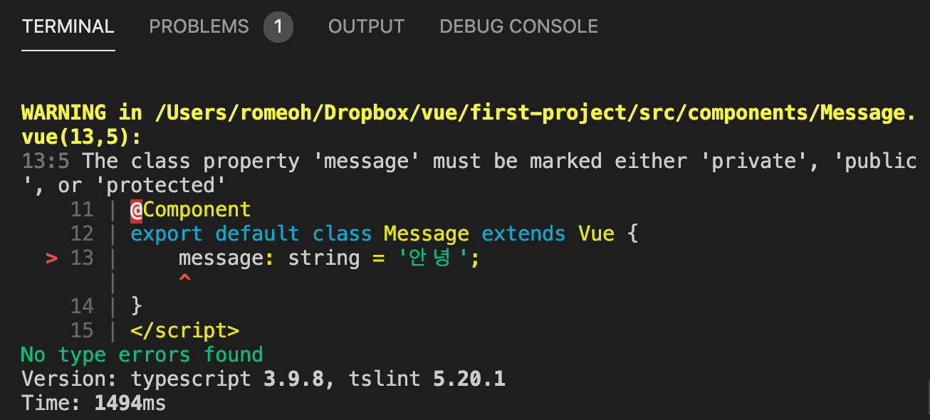 The class property 'message' must be marked either 'private', 'public', or 'protected'