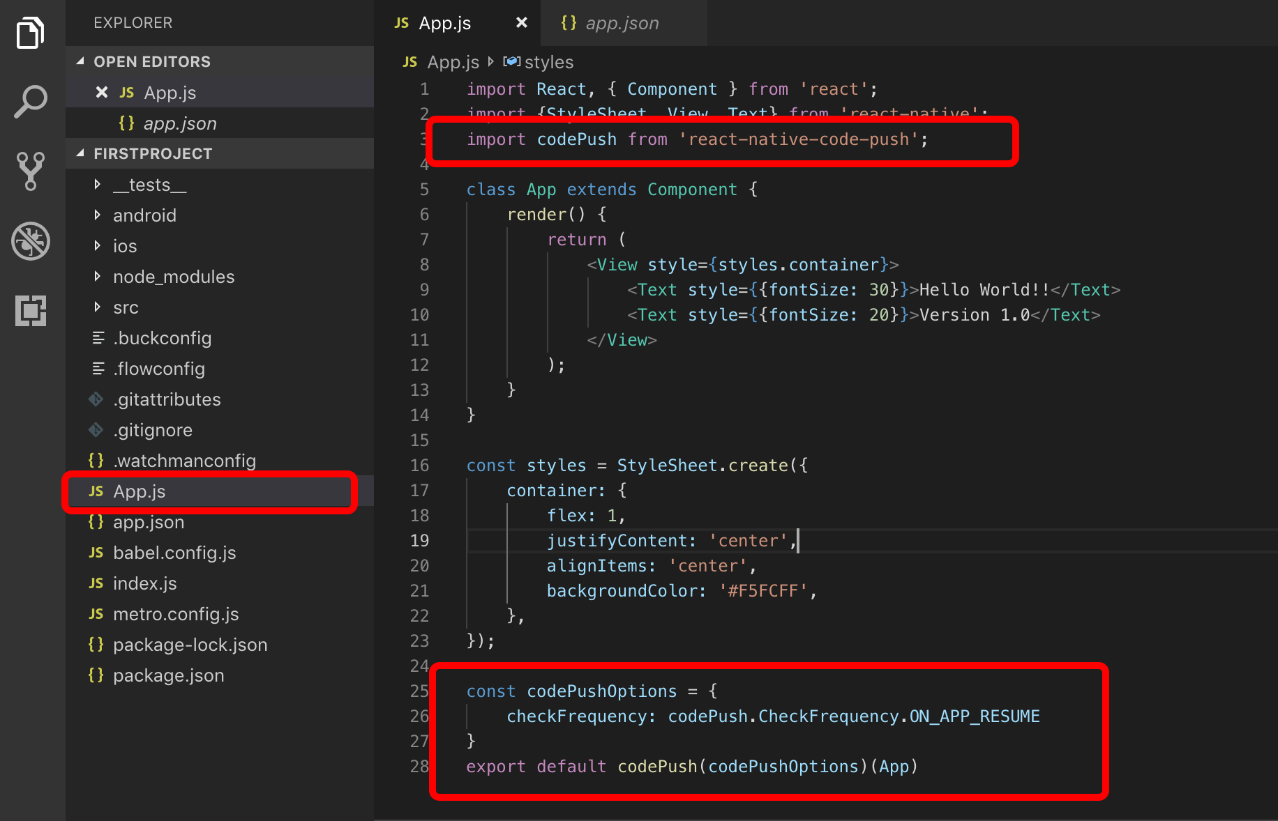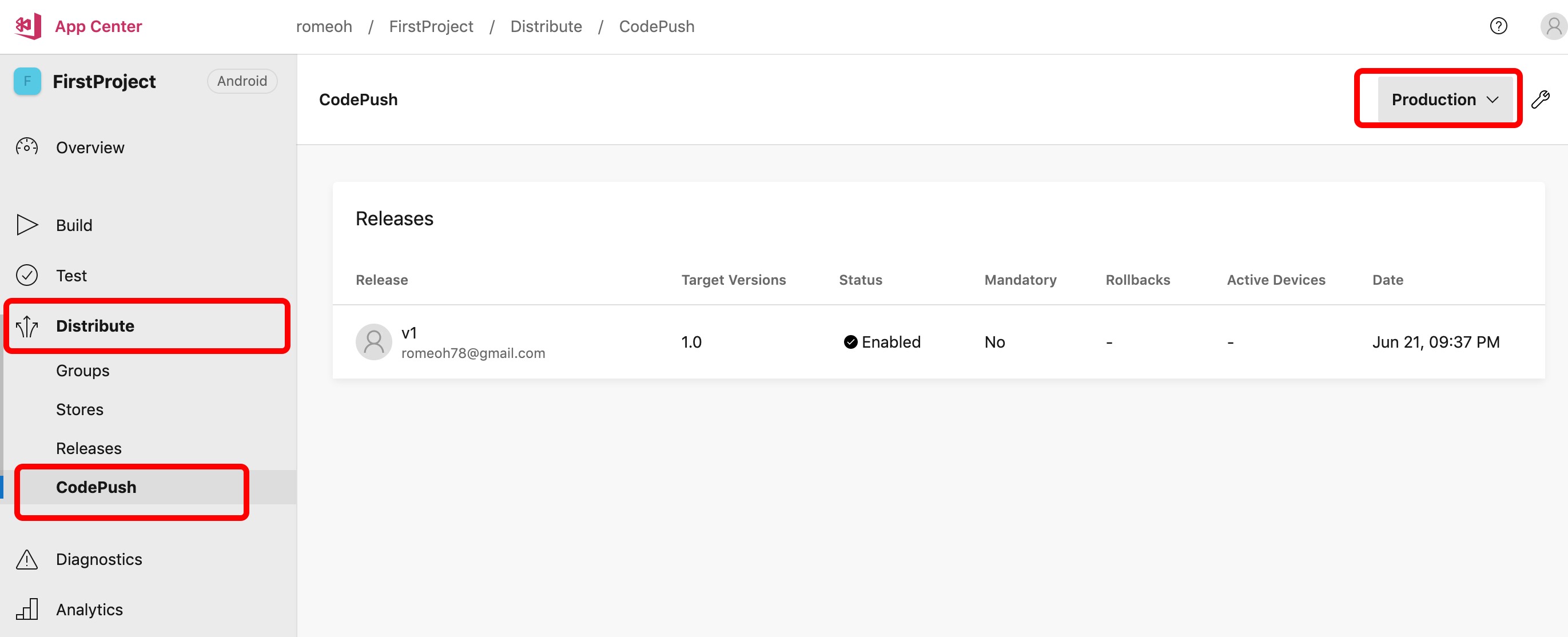 $ appcenter codepush release-react -a romeoh/FirstProject-1 -d Production