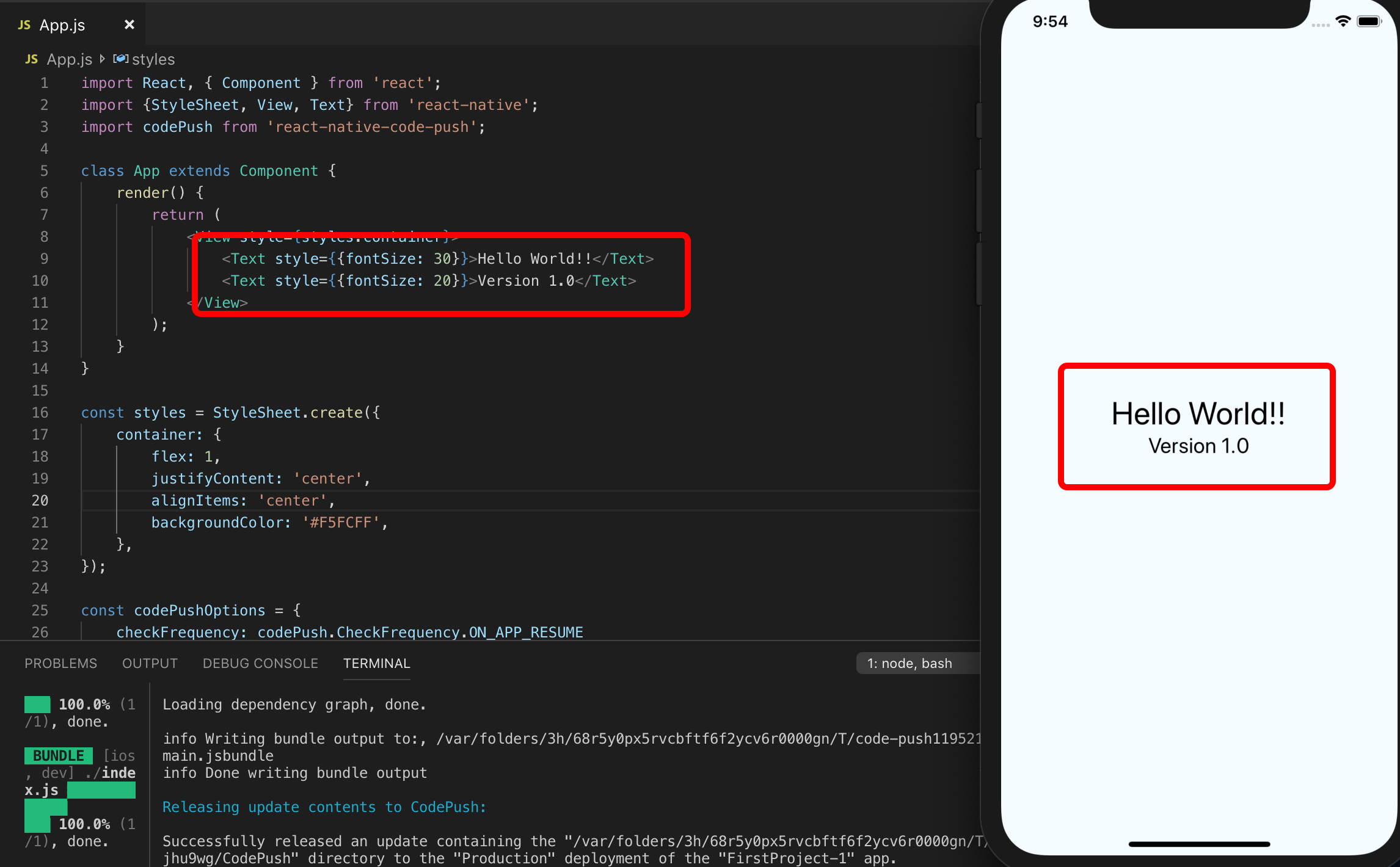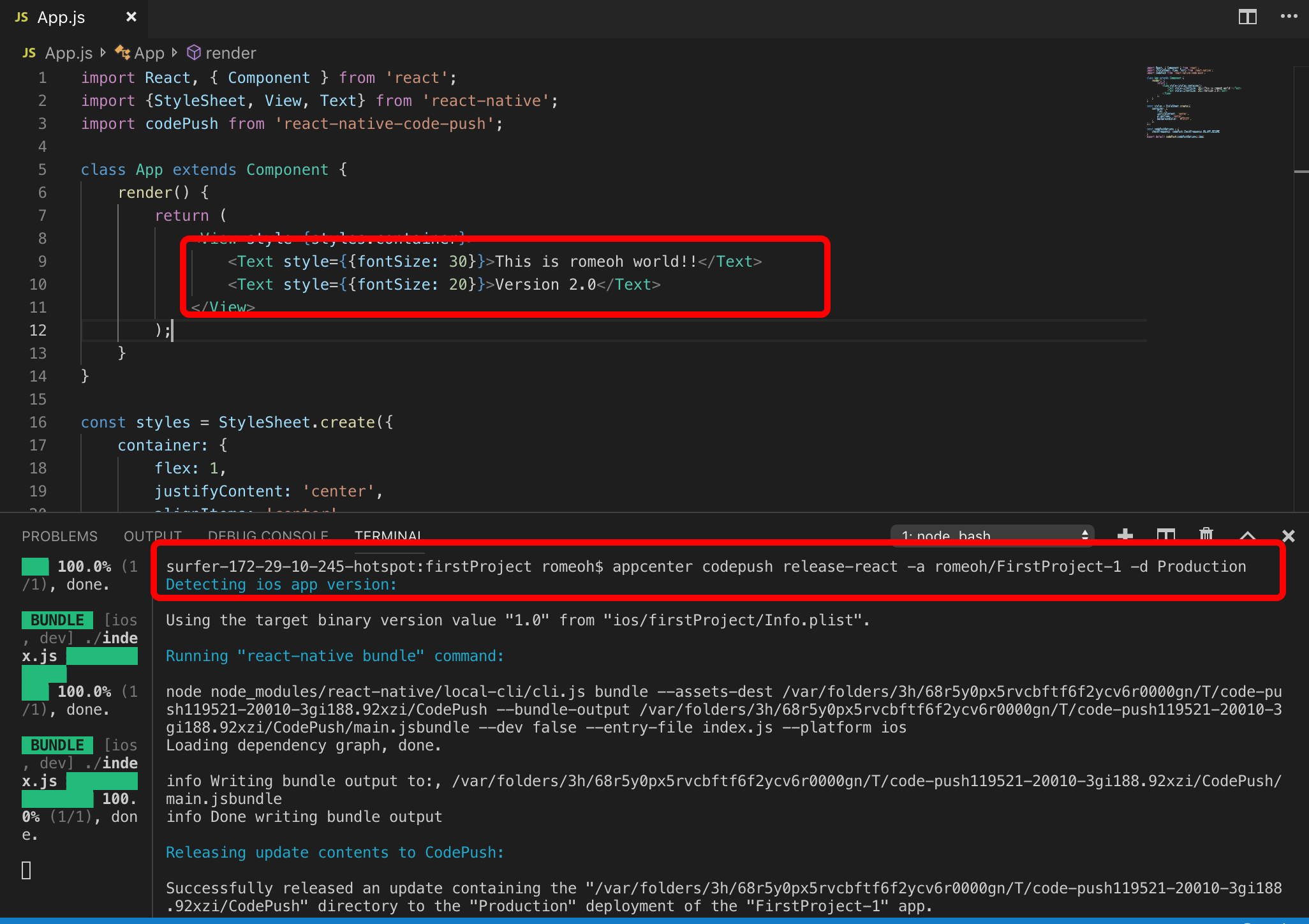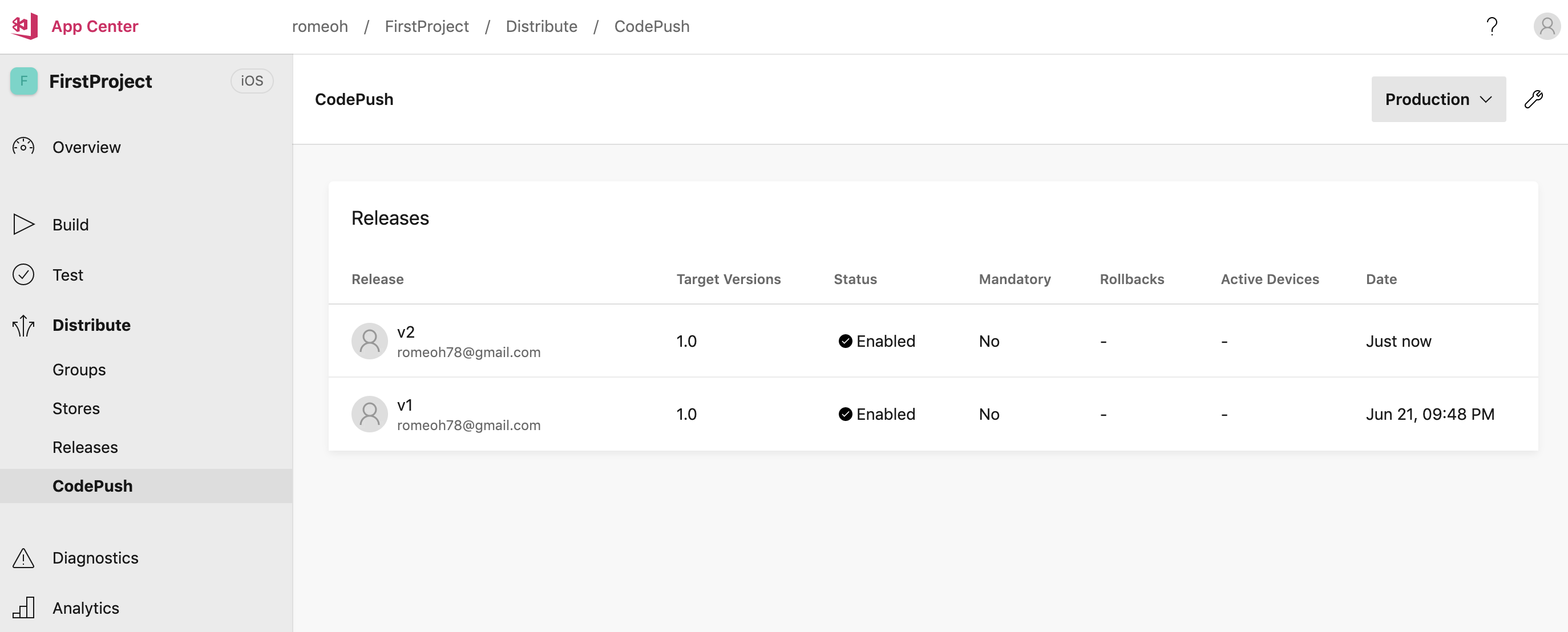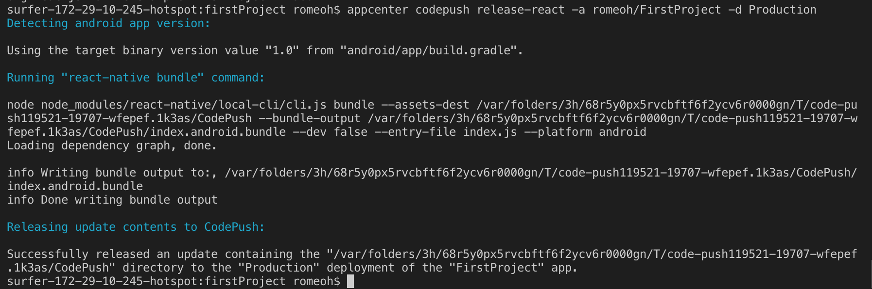$ appcenter codepush release-react -a romeoh/FirstProject -d Production