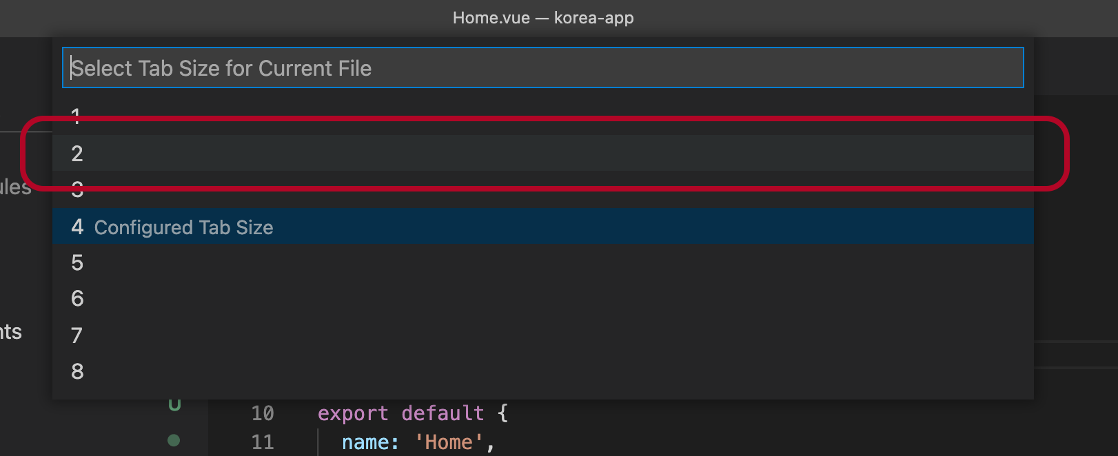탭사이즈가 스페이스 2로 설정되어 있지만