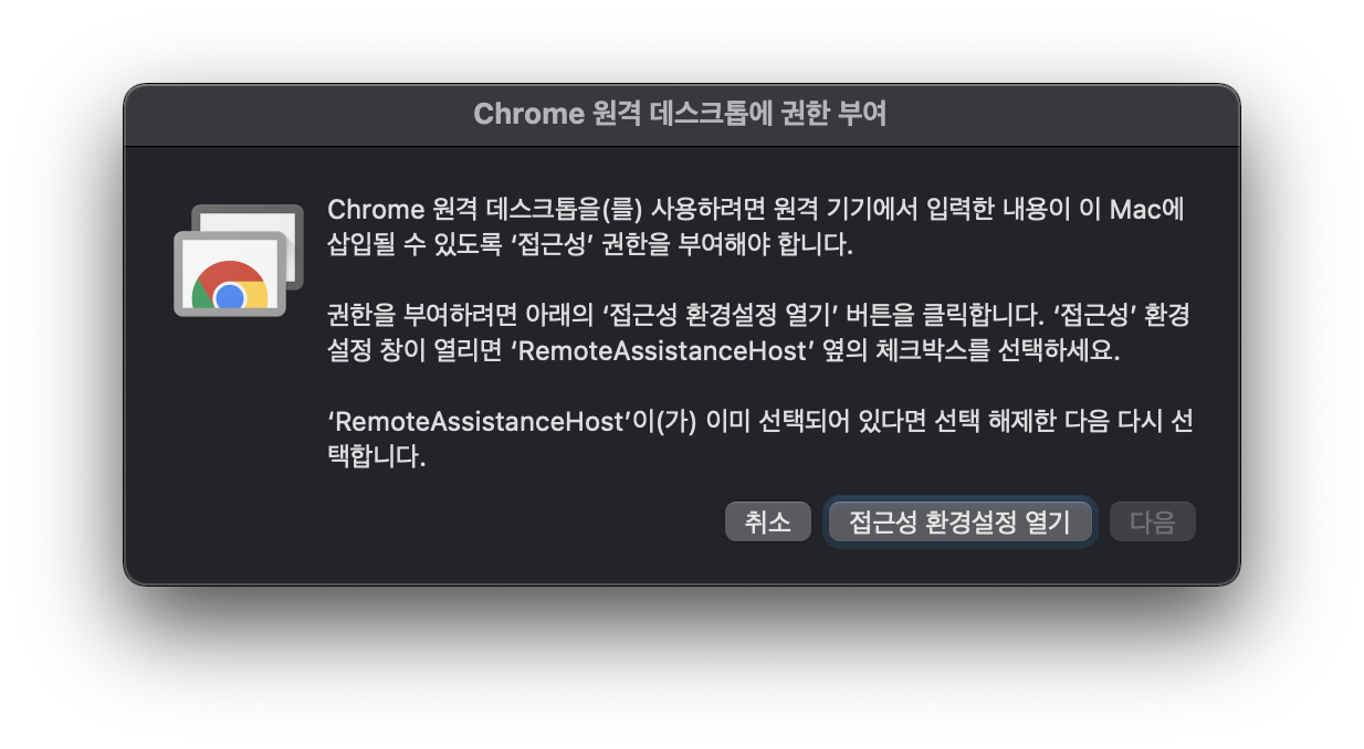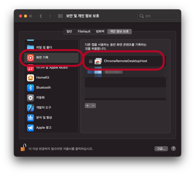 화면기록에서 ChromeRemoteDesktopHost를 체크합니다.