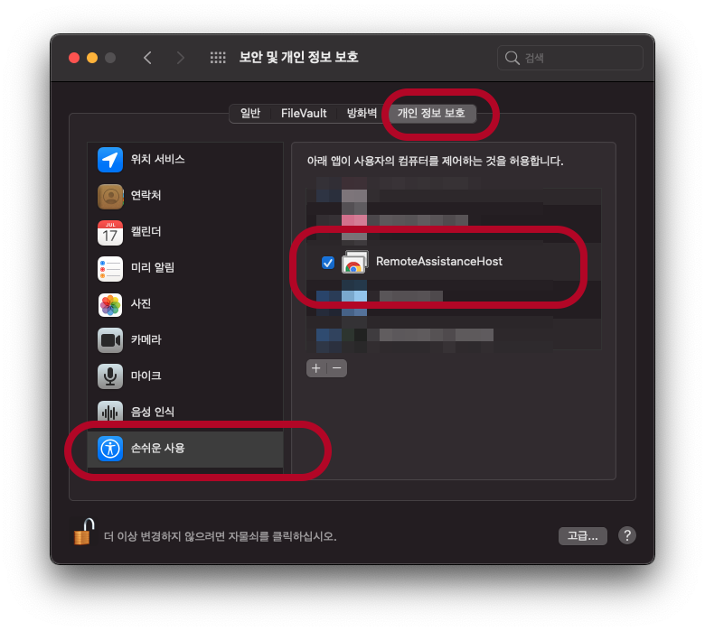 개인정보보호 > 손쉬운 사용 에서 RemoteAssistanceHost를 체크합니다.