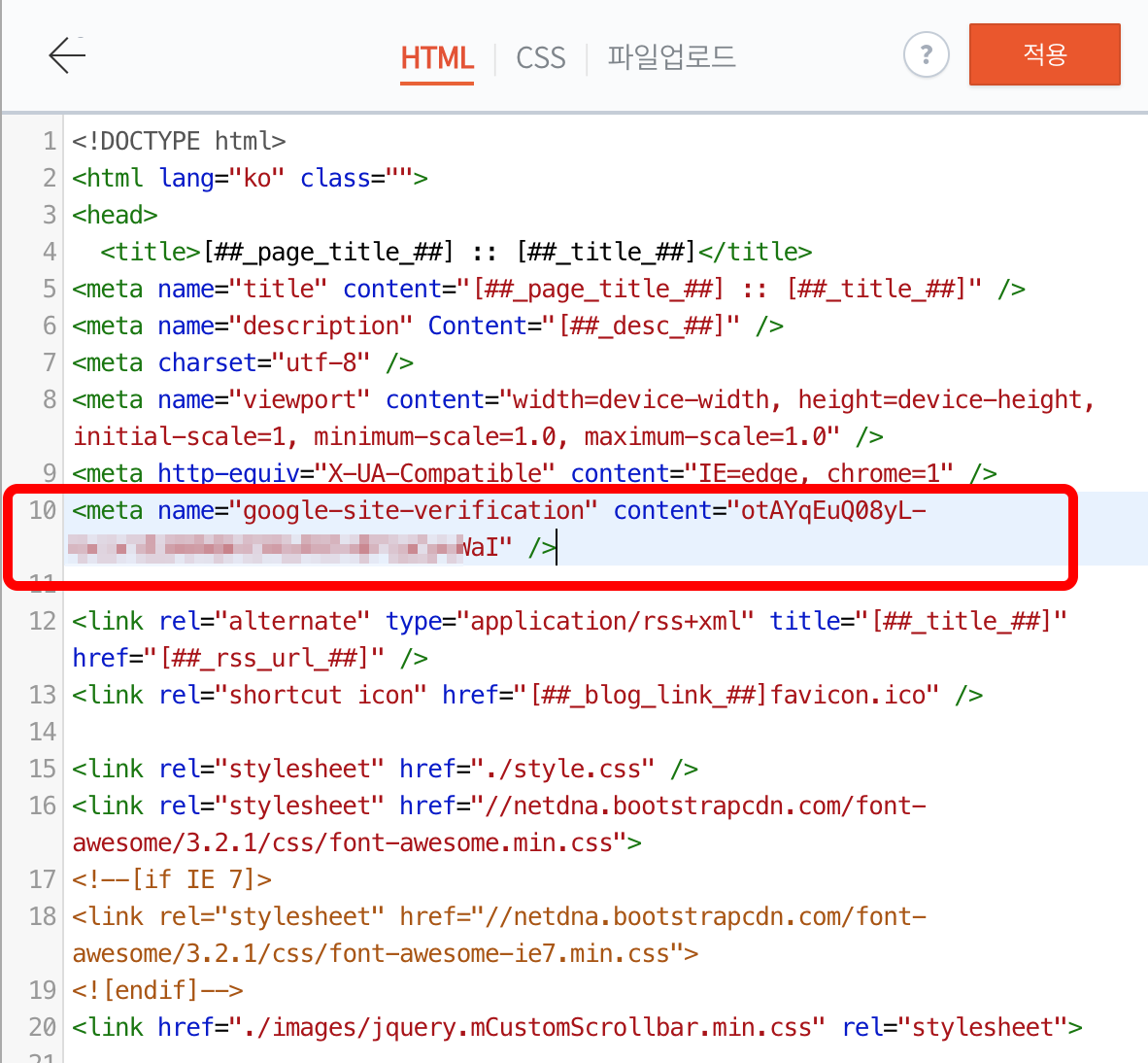 <head></head> 사이에 적당한 위치에 meta태그를 붙여넣기 하고 적용합니다.