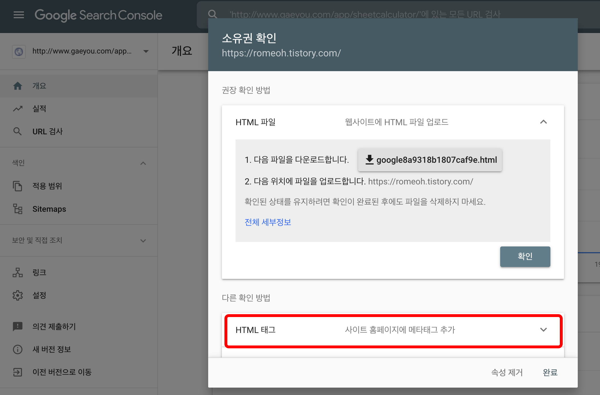 소유권 확인에서 HTML 태그를 선택합니다.