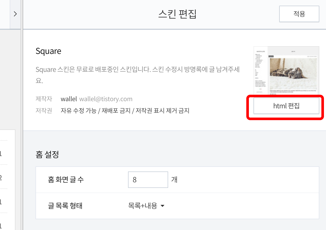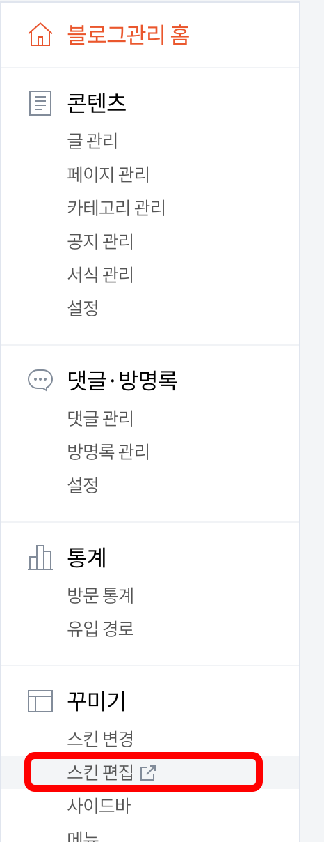 tistory 관리자 페이지에서 꾸미기 > 스킨편집을 선택합니다.