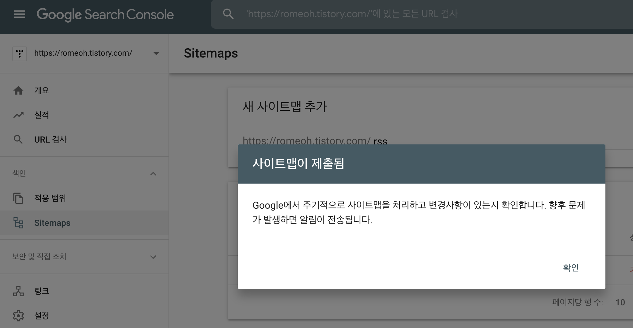 새 사이트맵 추가에서 https://romeoh.tistory.com/rss 를 입력하고 제출 버튼을 누릅니다.