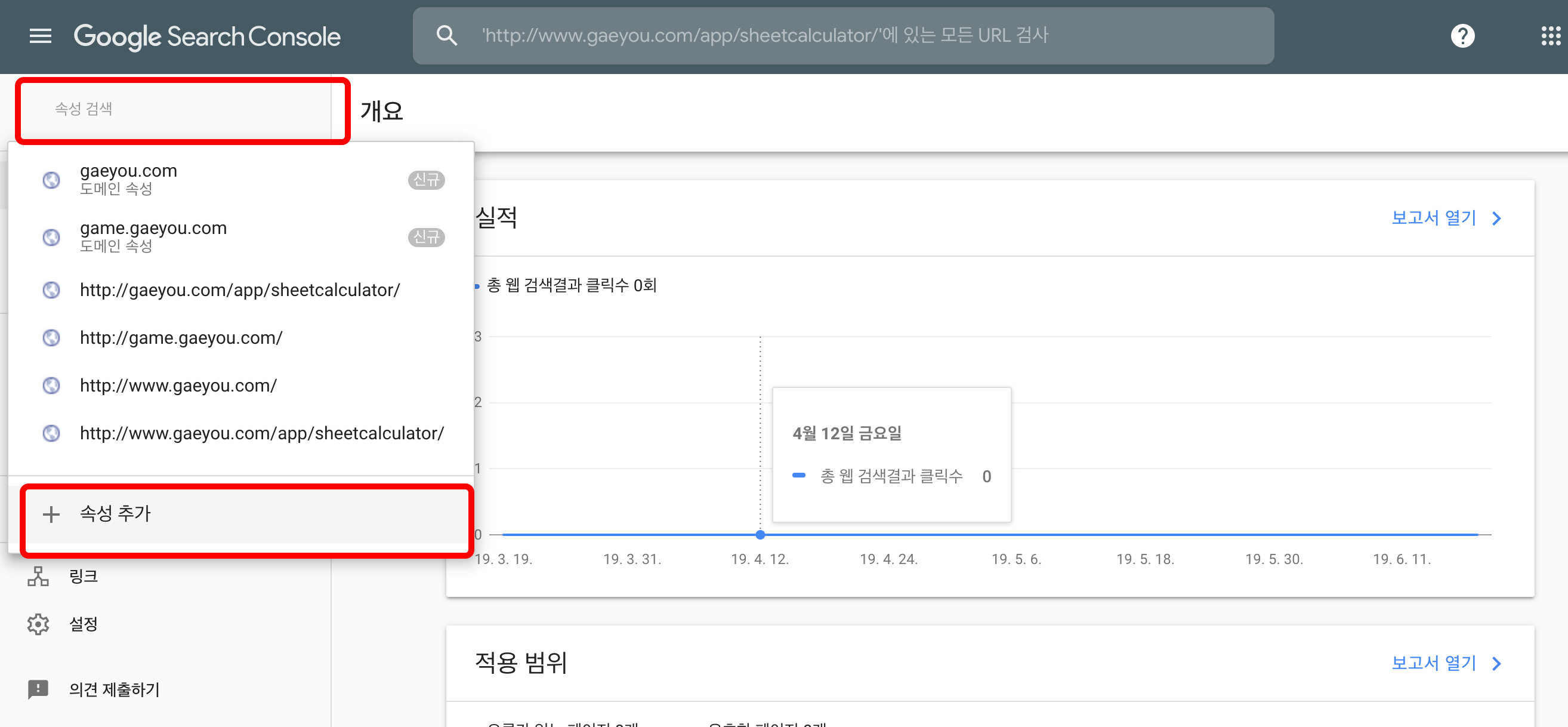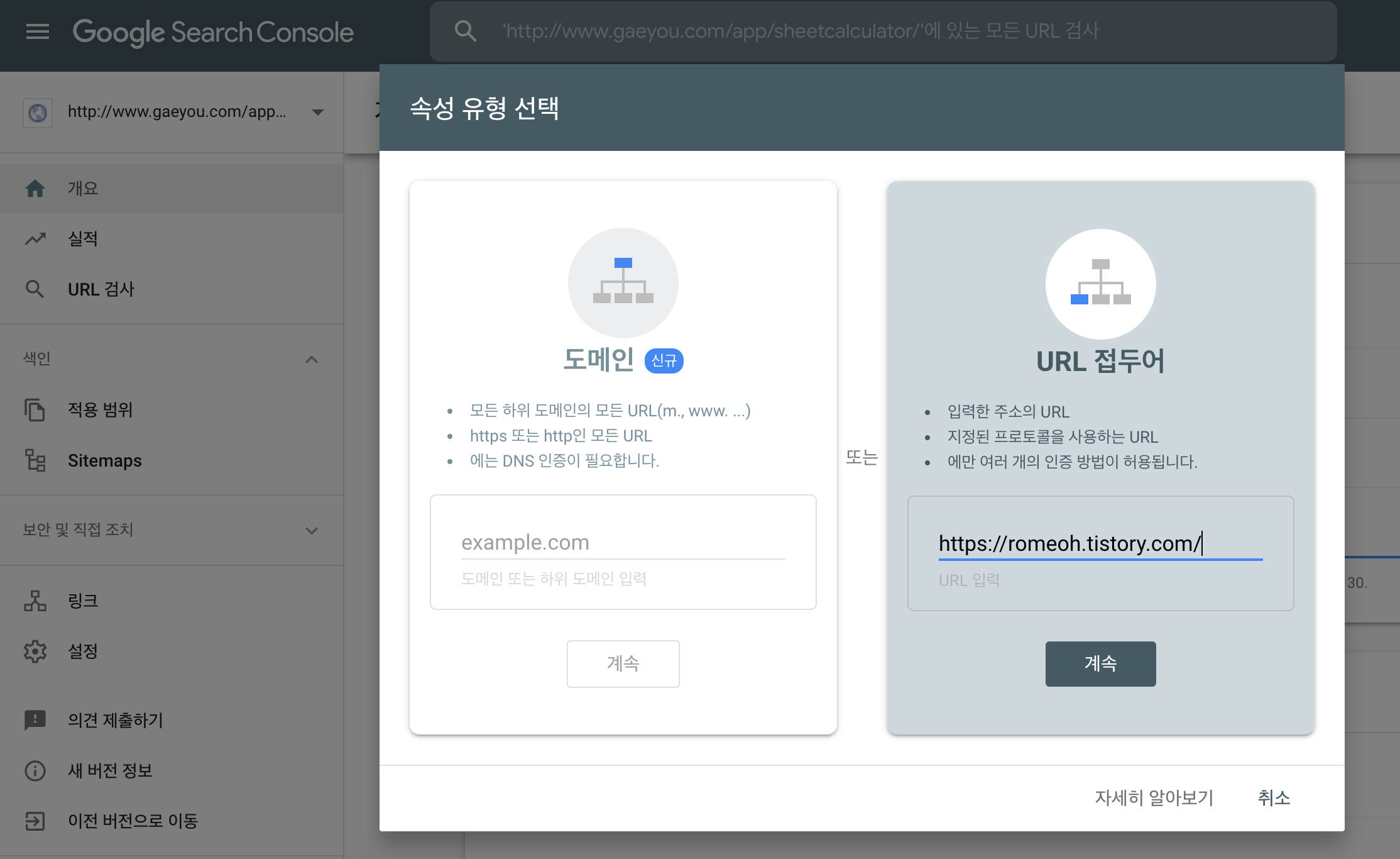 자신의 웹사이트의 경우 도메인에 url을 입력하고 계속버튼을 누르면 됩니다.