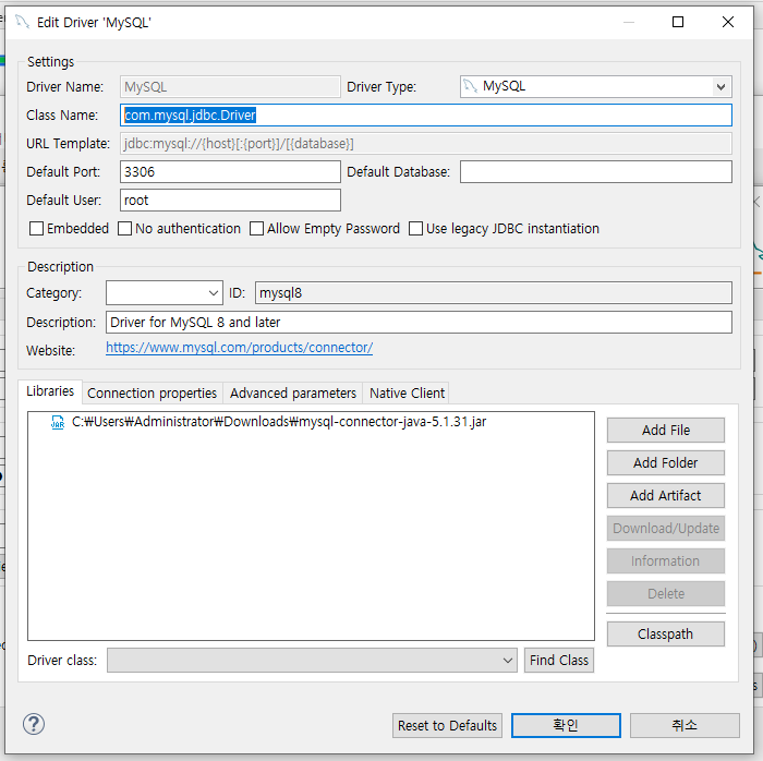 mysql-connector-java-5.1.31.jar 파일을 다운로드해서 경로를 설정합니다.
