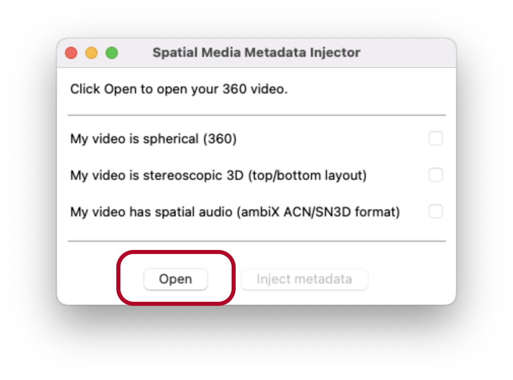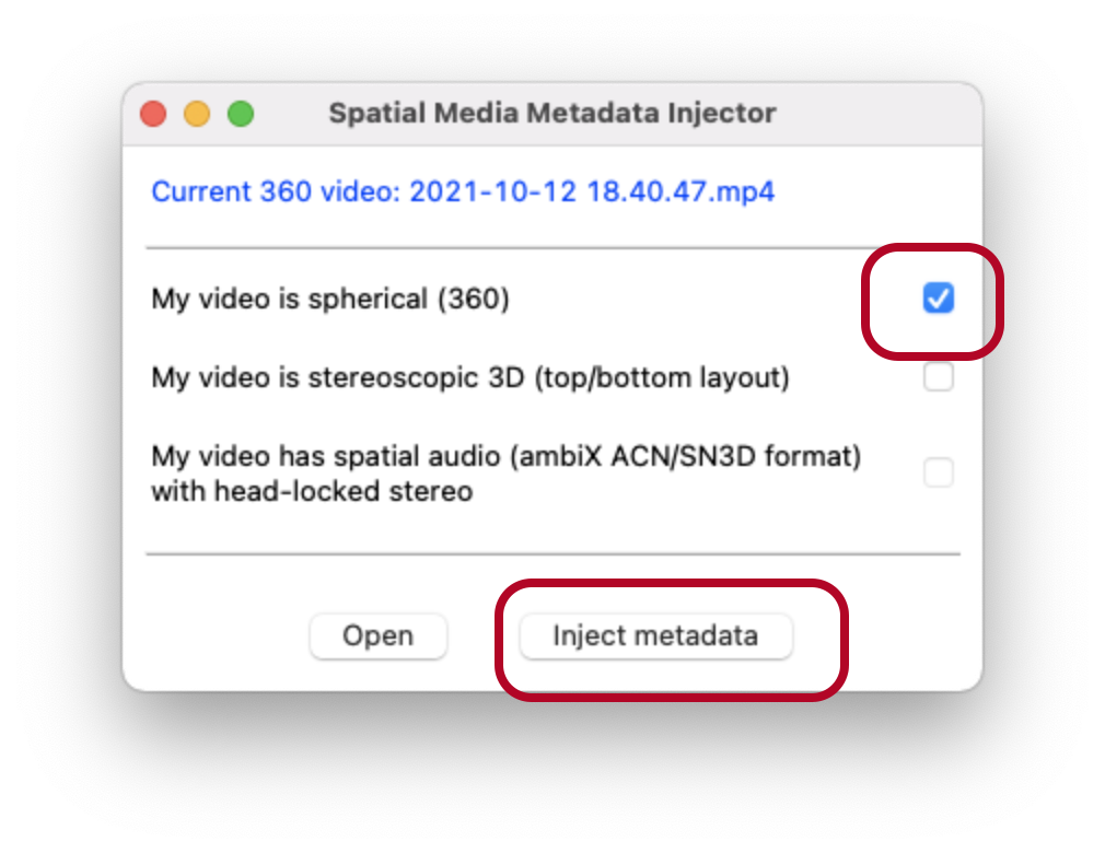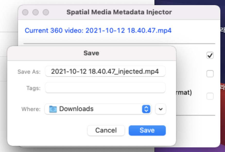 My Video is spherical을 선택하고 inject Metadata를 누릅니다.