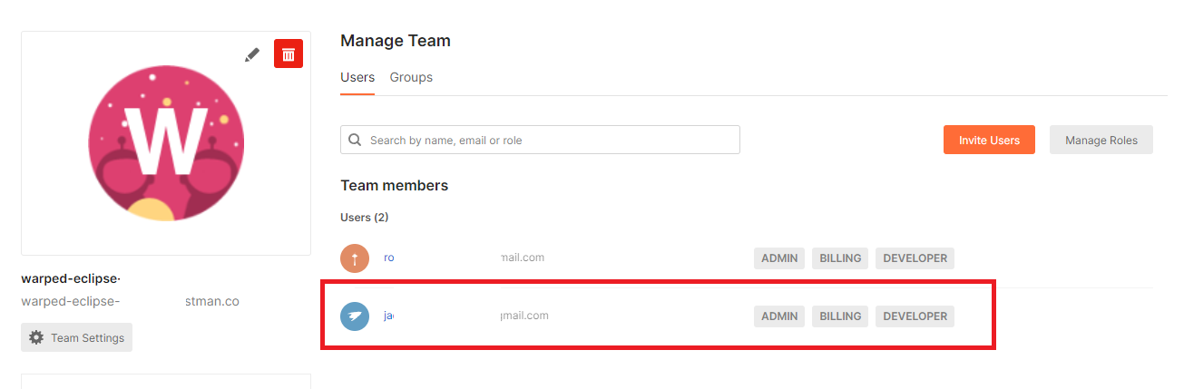 주소를 받은 멤버가 멤버 등록하면 Team members에 사용자를 확인할 수 있습니다.