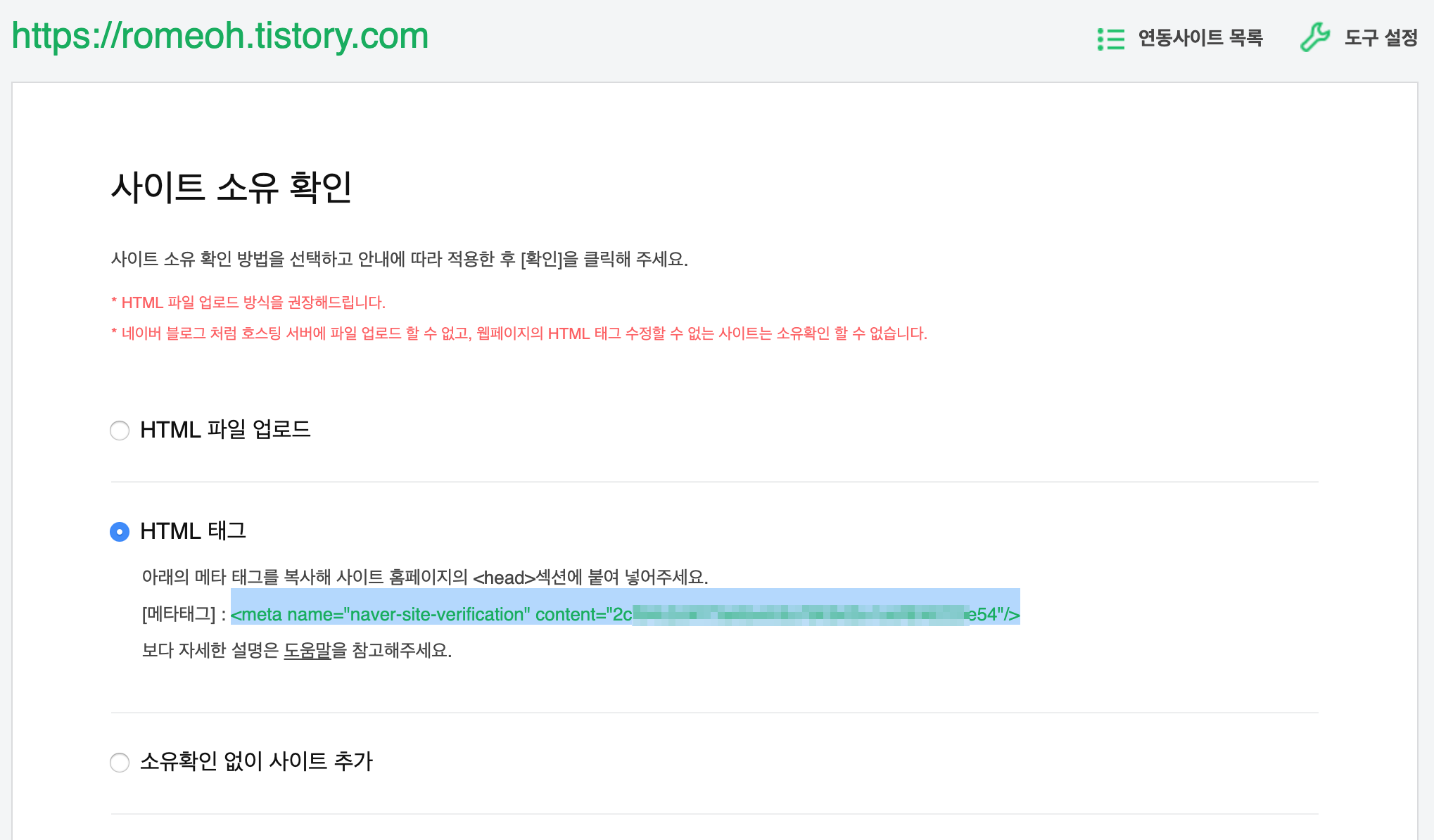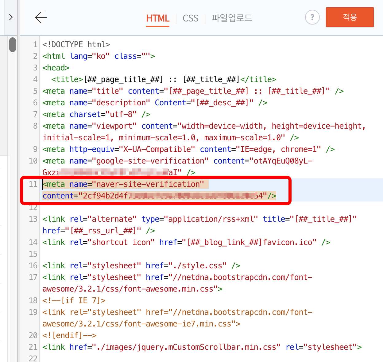 복사한 meta 태그를 <head></head> 사이에 적당한 위치에 붙여넣기하고 적용을 누릅니다.