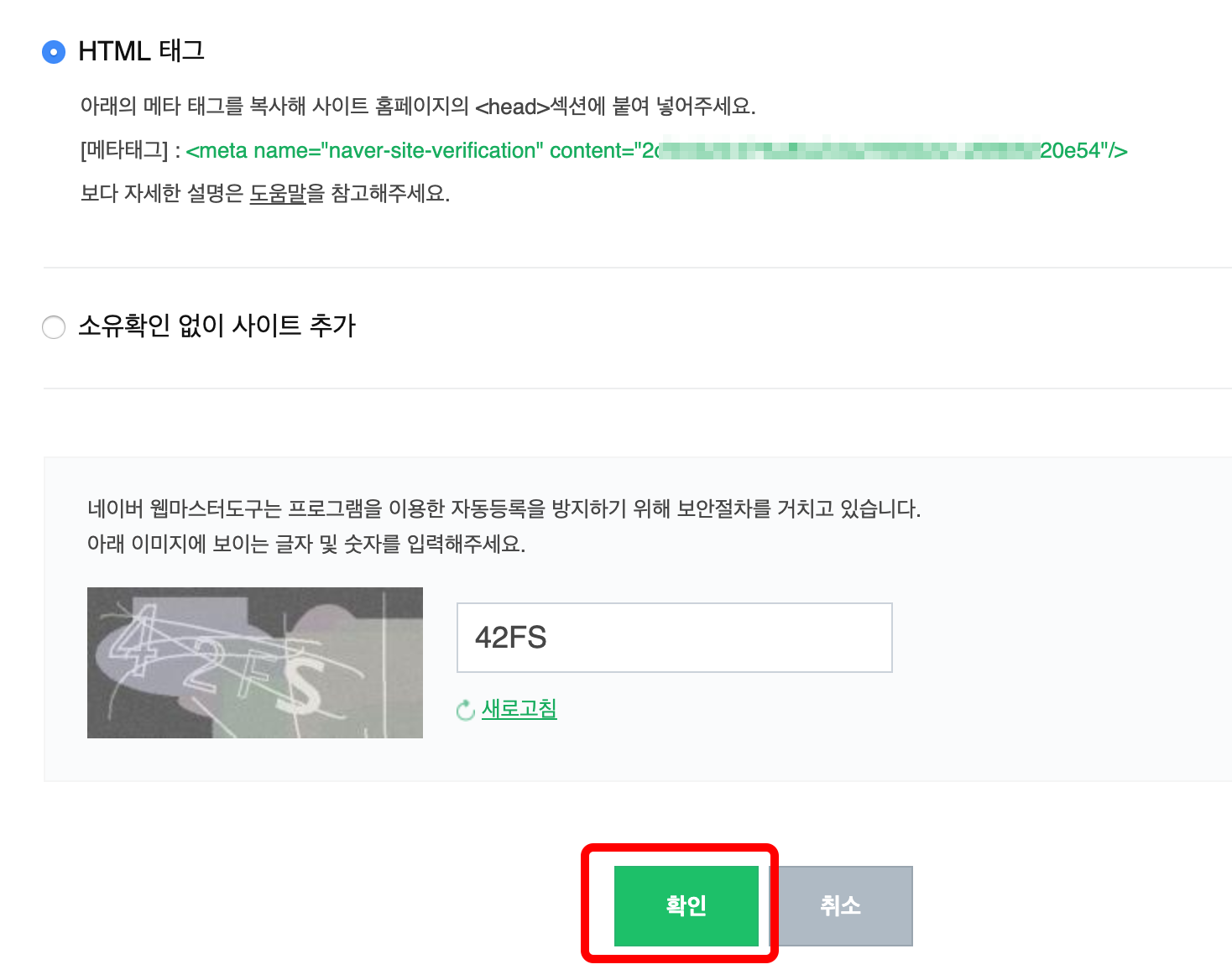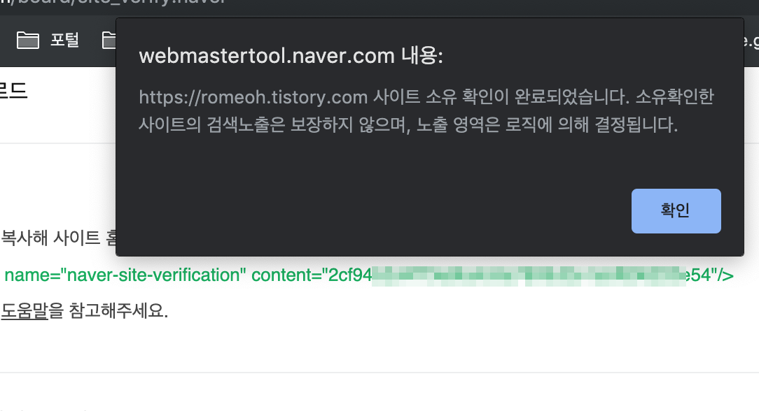 네이버 웹마스터툴에서 확인 버튼을 누릅니다.