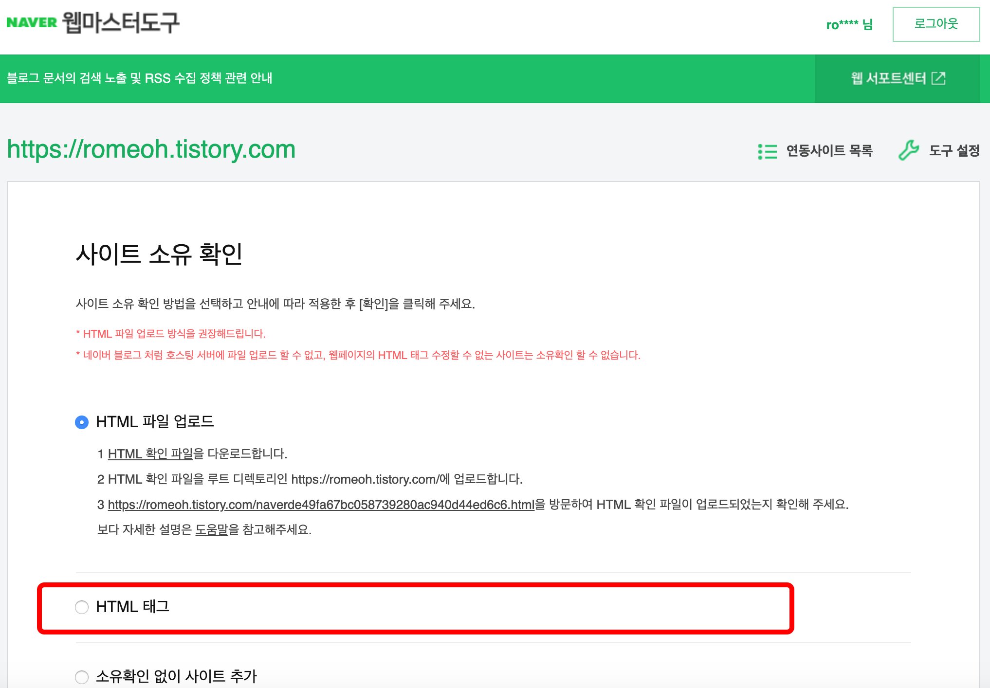 등록한 블로그를 선택하고 요청 > RSS 제출에서 https://romeoh.tistory.com/rss 입력하고 확인 버튼을 누릅니다.