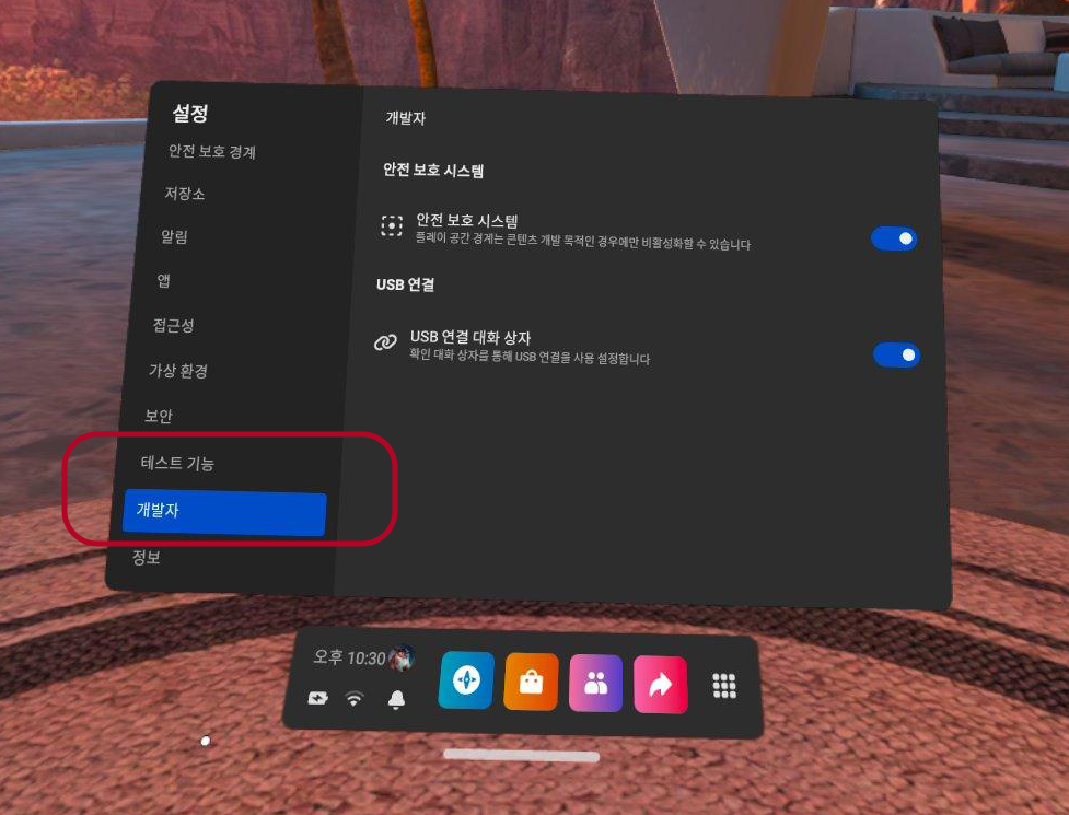 테스트 기능, 개발자 메뉴가 활성화 됩니다.