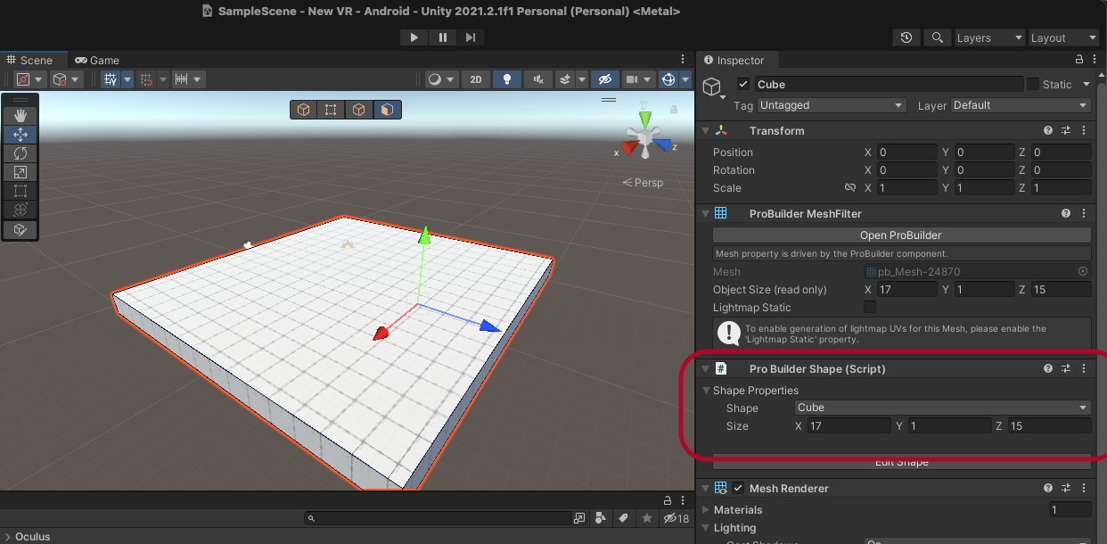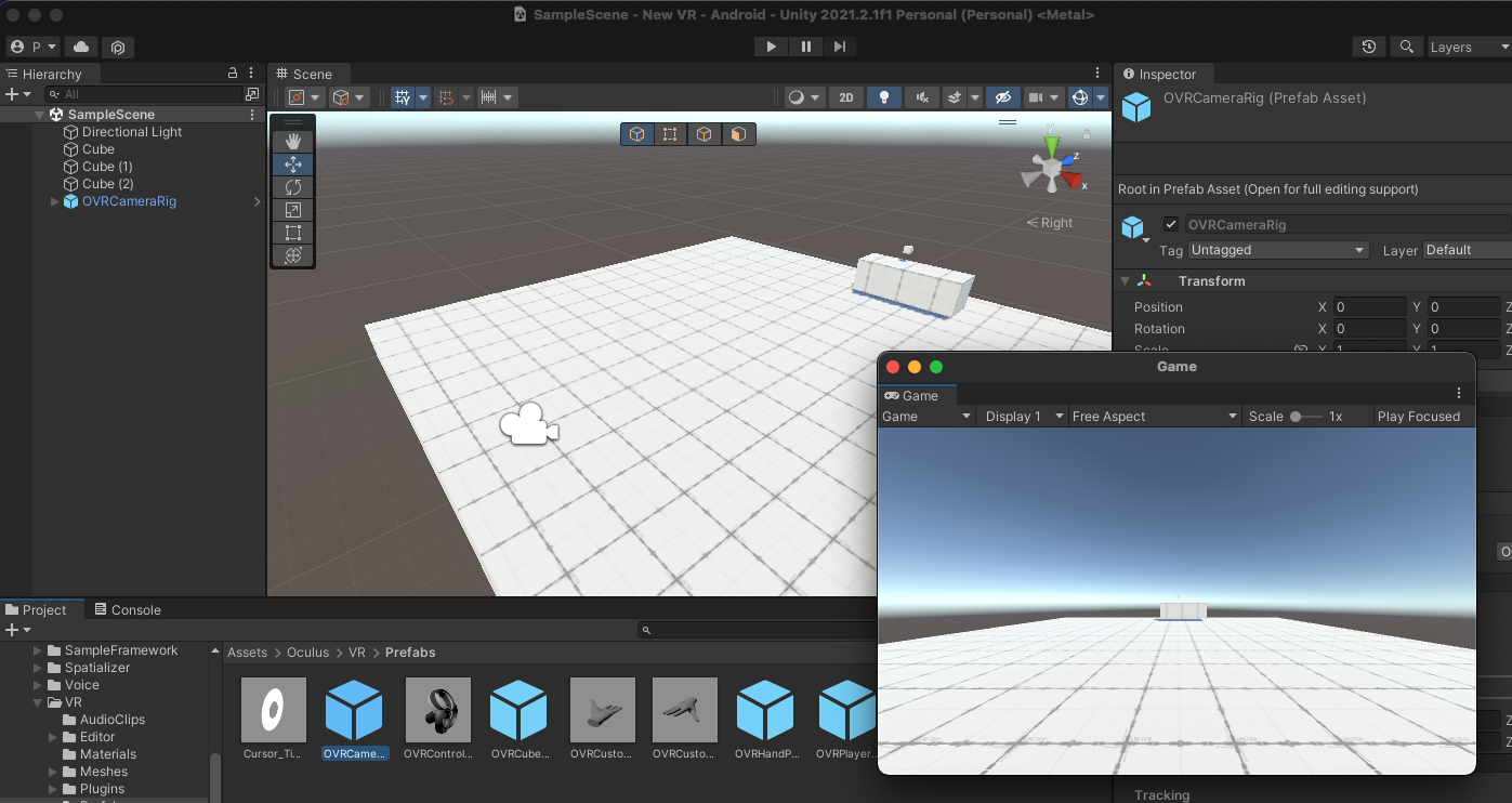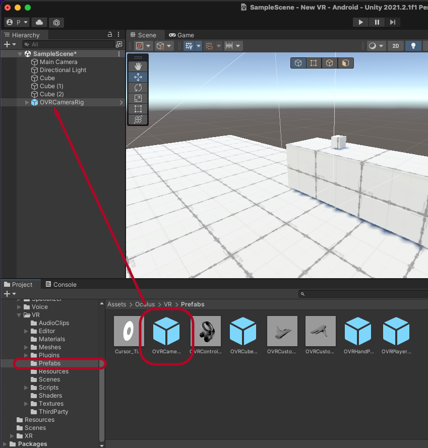 Assets > Oculus > VR > Prefabs에서 OVRCameraRig를 씬에 올립니다.