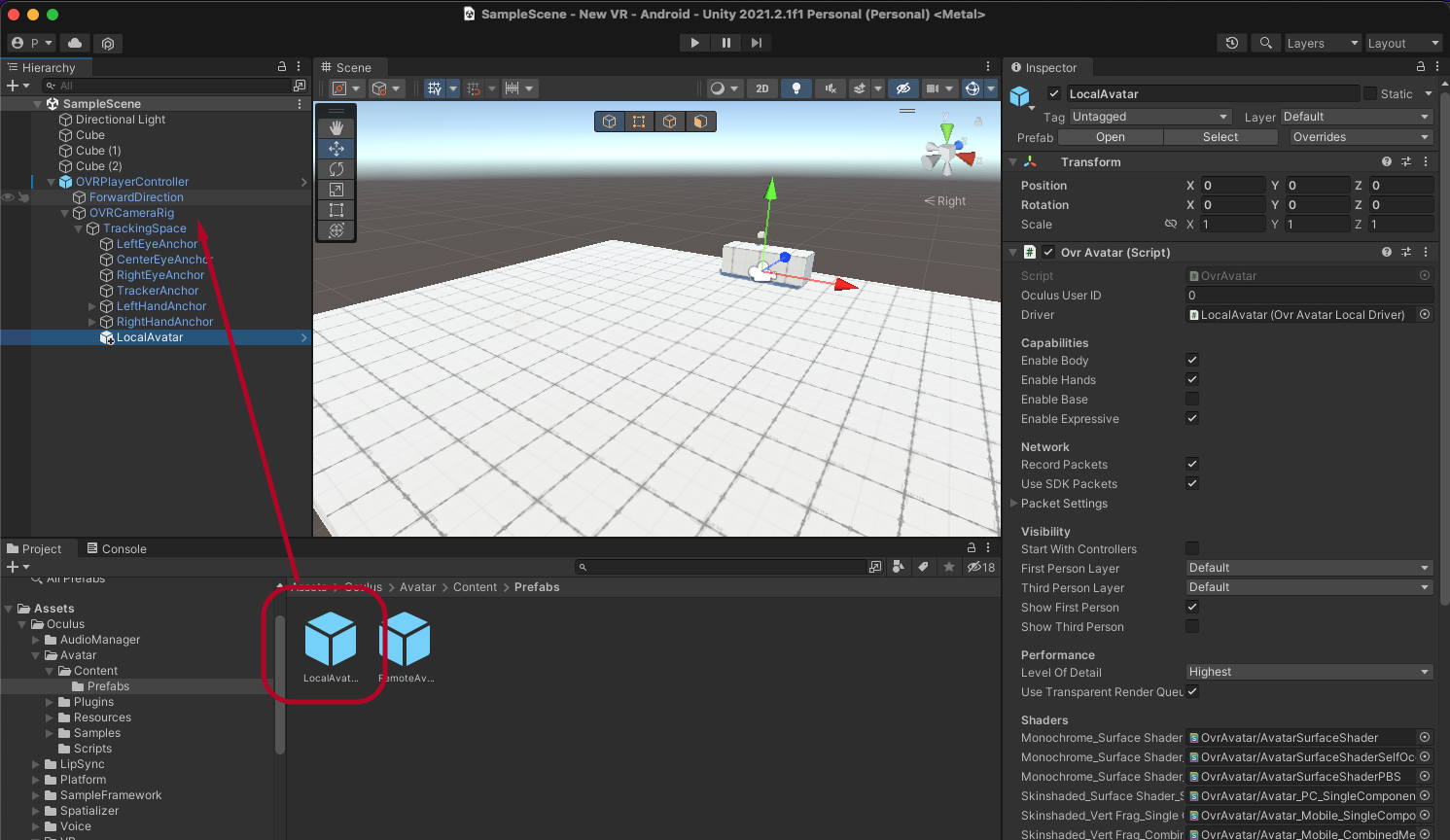 Assets > Oculus > Avatar > Content > Prefebs에서 LocalAvatar를 Tracking Space에 추가해서 Build And Run 합니다.