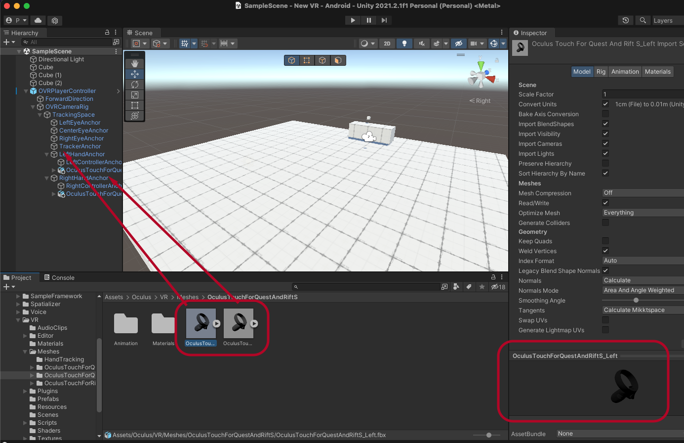 Assets > Oculus > VR > Meshes > OculusTouchForQuest2에서 Left, Right Controller를 확인 할 수 있습니다.