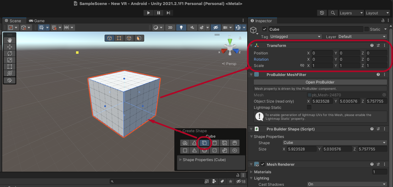 Cube를 선택하고 Scene에 Cube를 그리고 Transform을 reset 합니다.