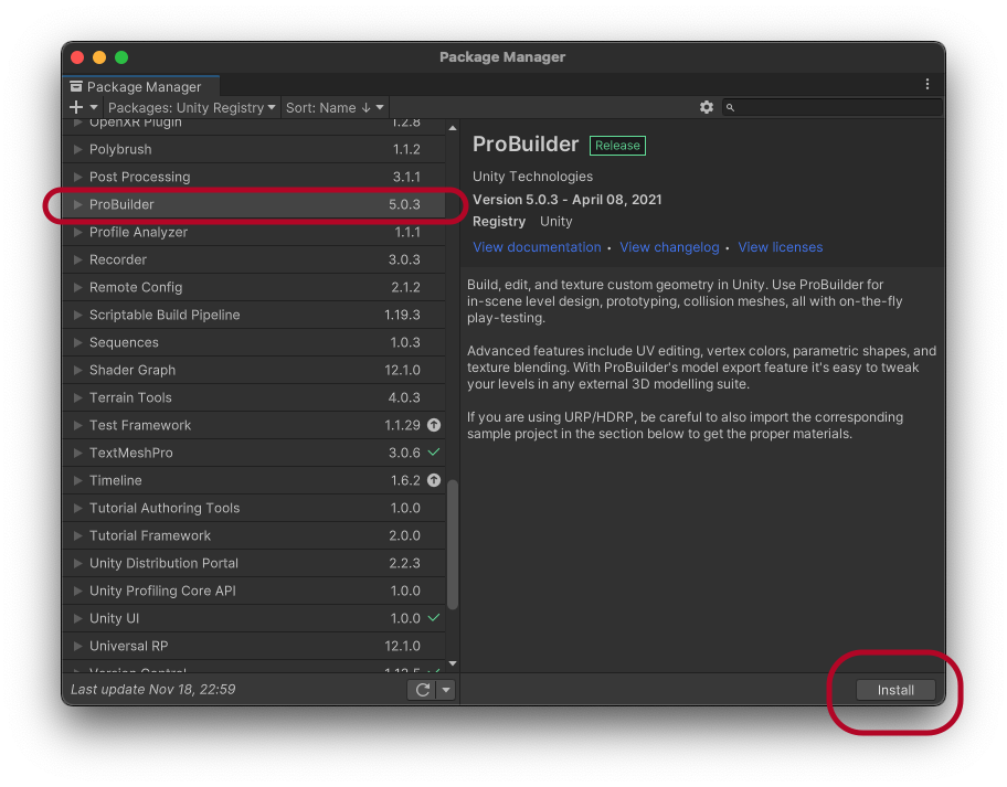 Window > Package Manager를 열고 ProBuilder 를 설치합니다.