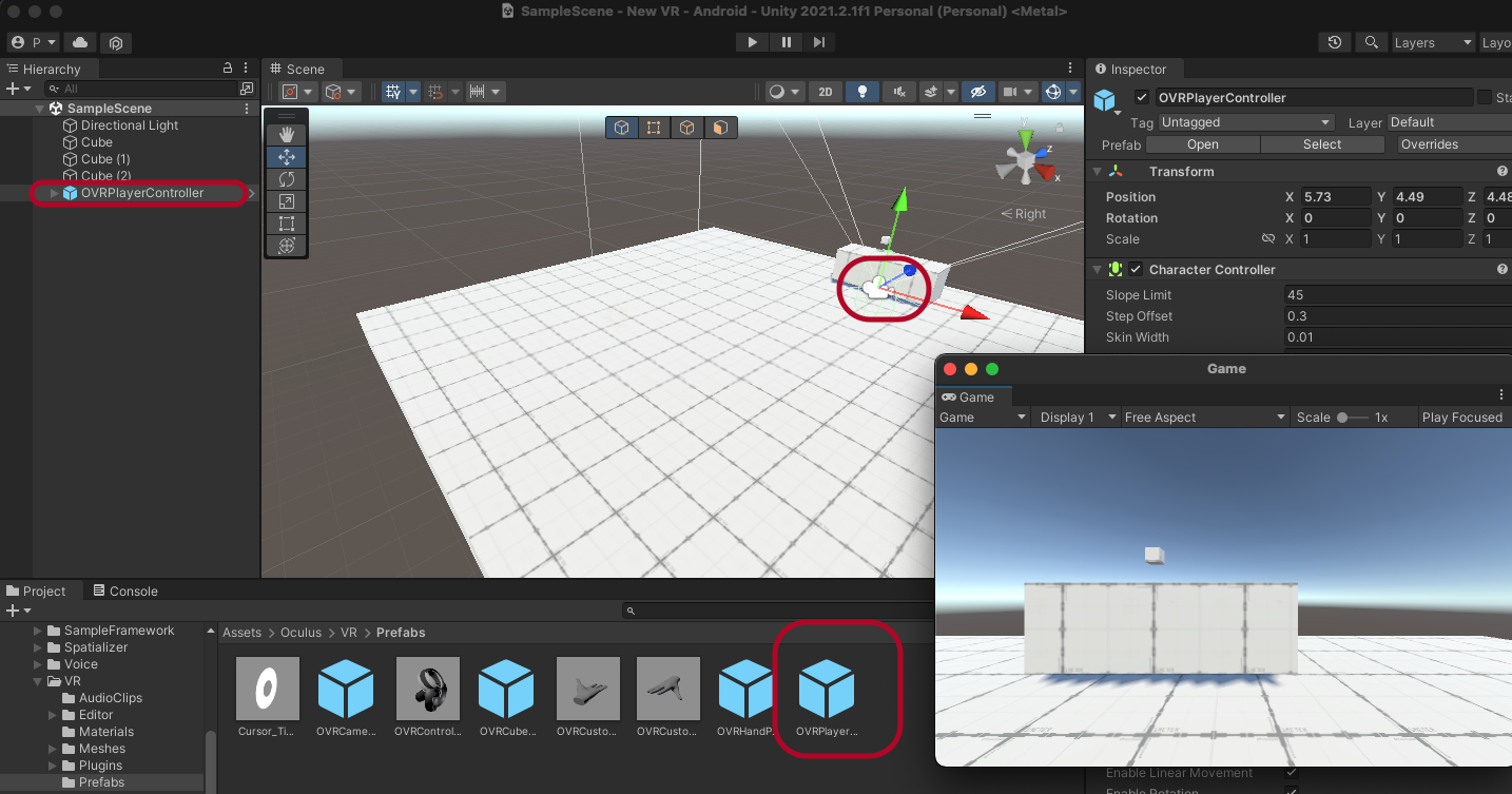 Assets > Oculus > VR > Prefabs에서 OVRPlayerController를 씬에 올리고 적당히 위치를 조절합니다.