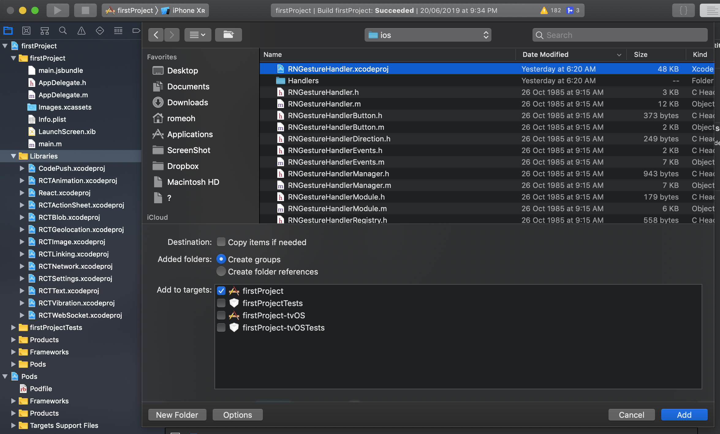 /node_modules/react-native-gesture-handler/ios/RNGestureHandler.xcodeproj 선택하고 Add합니다.
